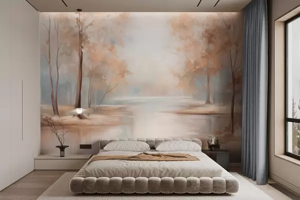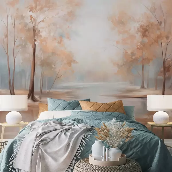 Fototapet Peisaj texturat de toamnă cu copaci și un râu, culori delicate, atmosferă luminoasă și aerisită, scenă pașnică și liniștită Nr. w09541