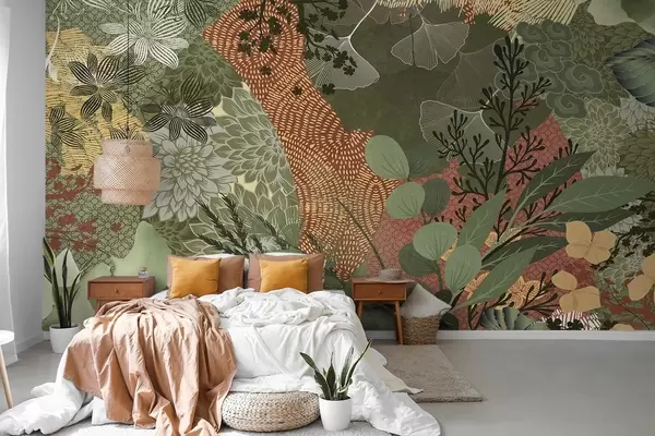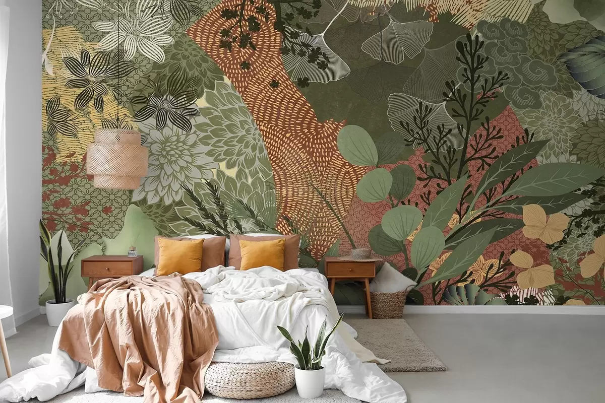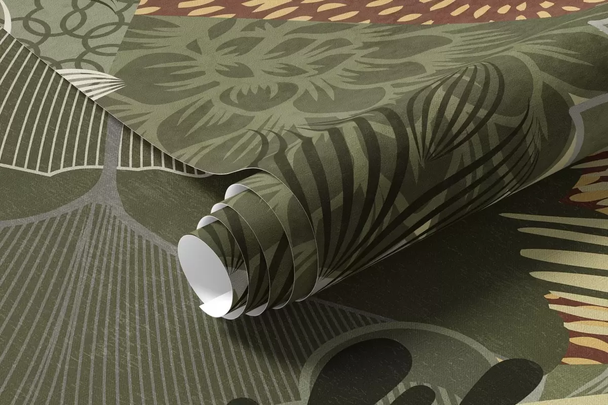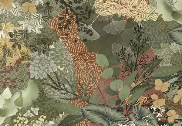 Fototapet Colaj abstract texturat cu elemente botanice, frunze, flori și texturi organice, în nuanțe de verde și maro. Nr. w09545