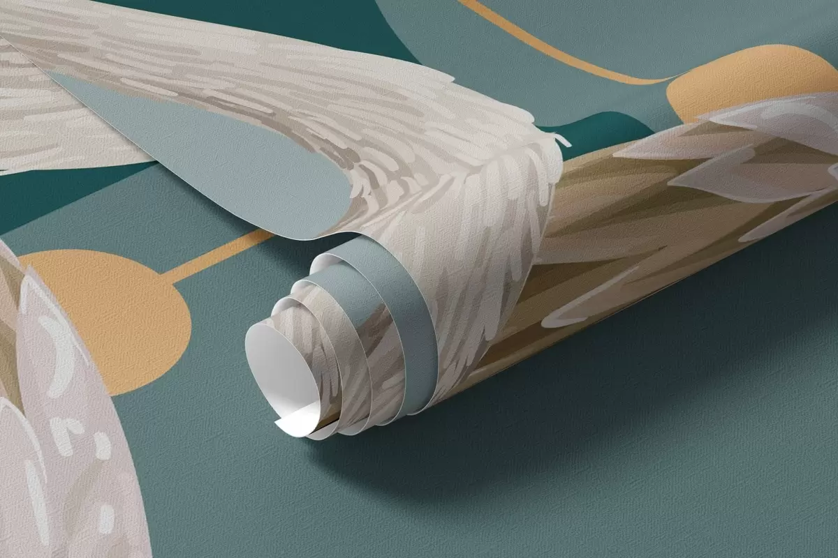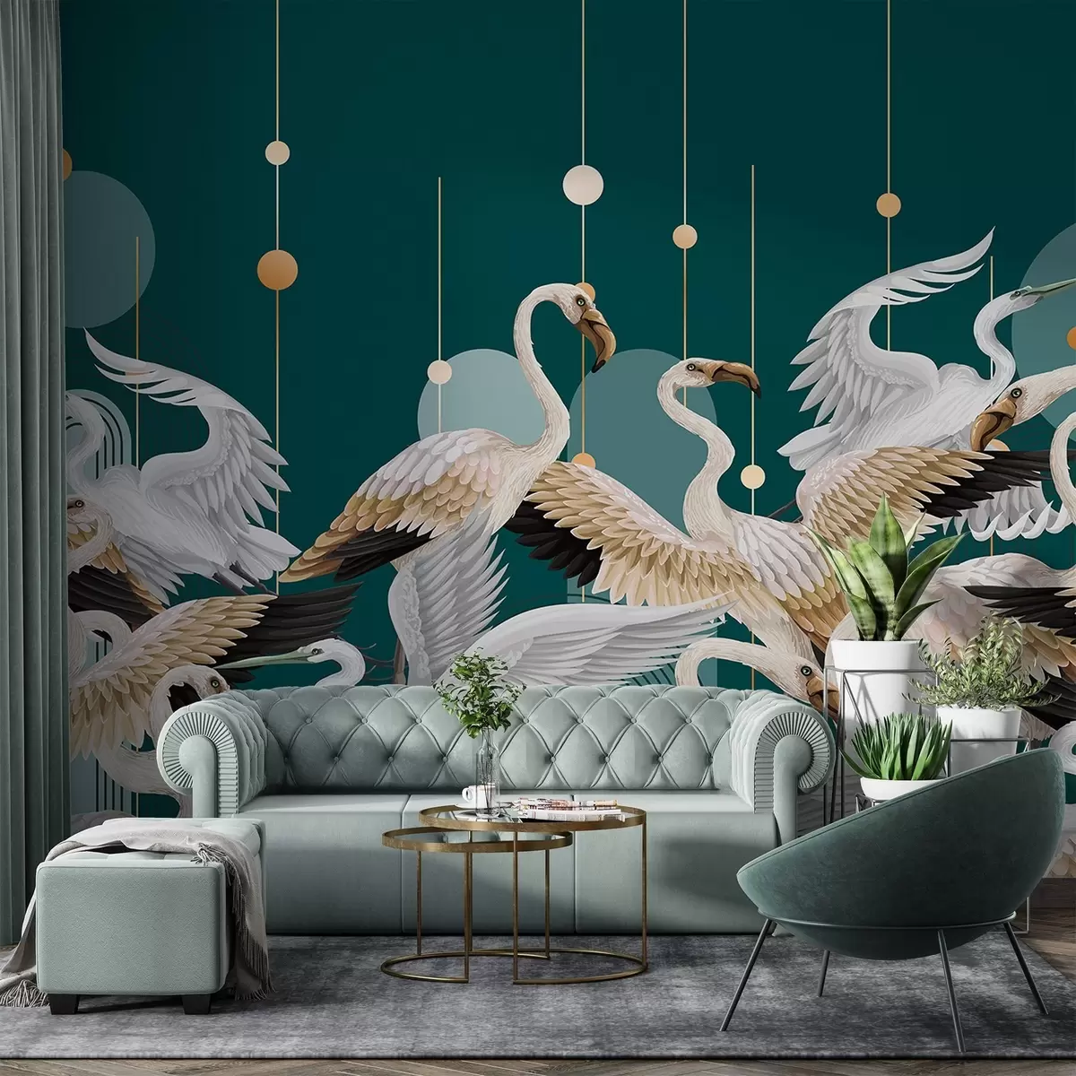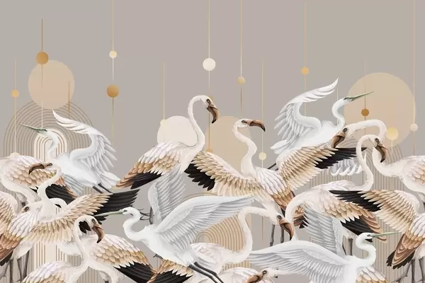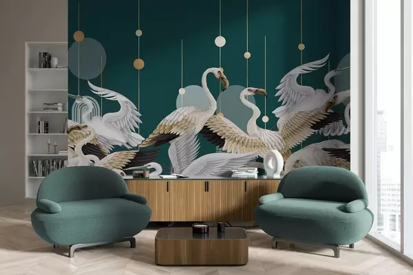 Fototapet Un stol de flamingo albi cu aripi delicate, pe un fundal verde-albastru închis cu linii și cercuri galbene Nr. w09546