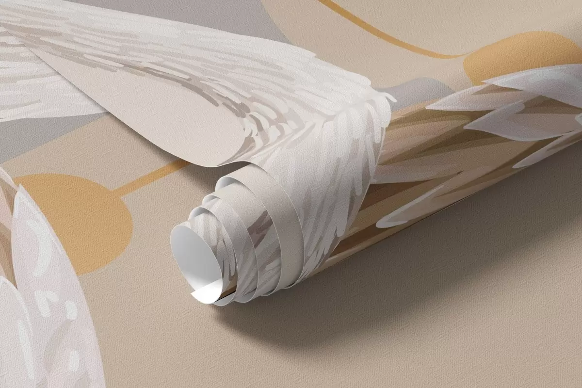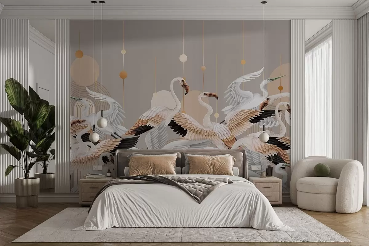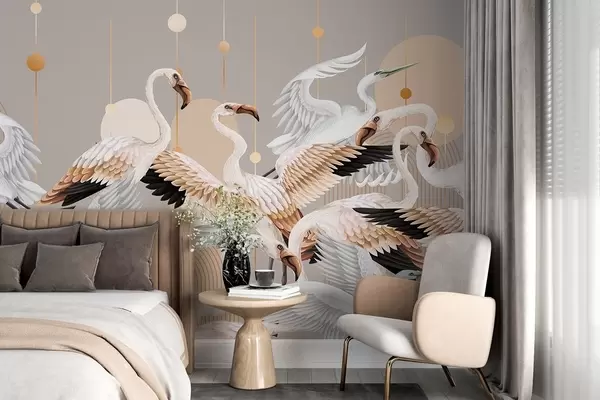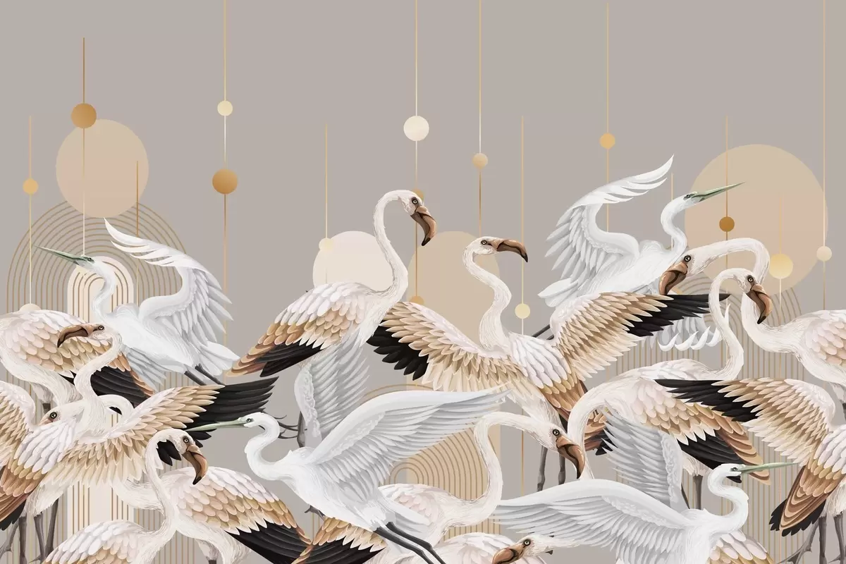 Fototapet Un stol de flamingo albi cu aripi delicate, pe un fundal neutru cu linii și cercuri galbene Nr. w09546v1