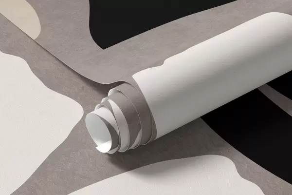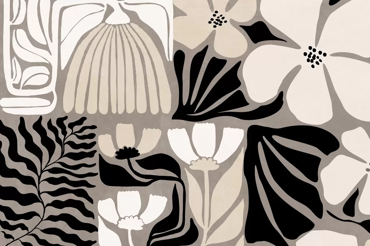Fototapet Flori și frunze stilizate în stil minimalist modern, în culori bej, negru și alb, texturate pe un fundal gri Nr. w09547