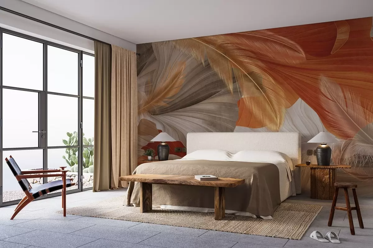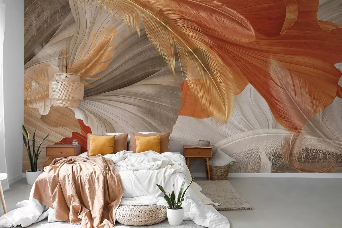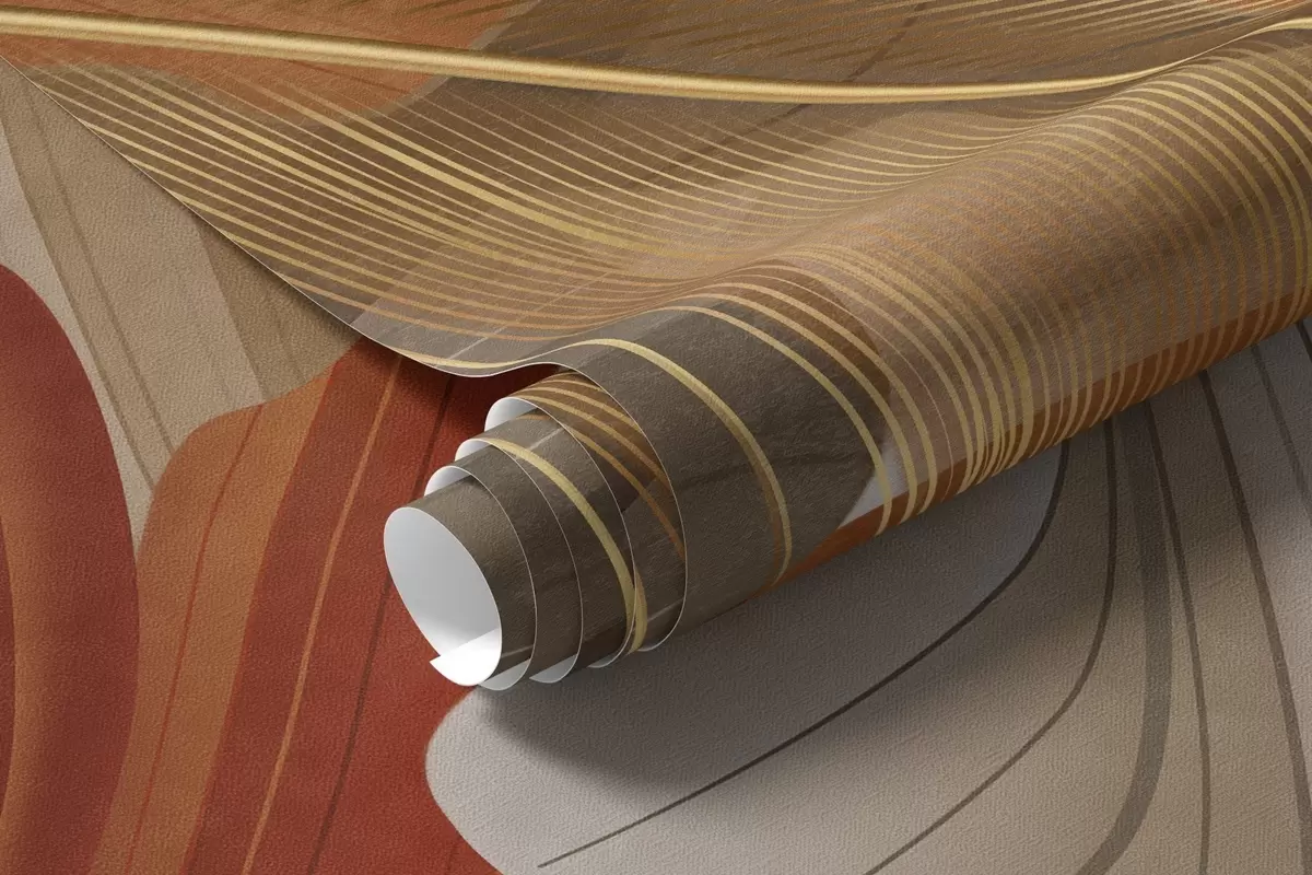 Fototapet Forme abstracte texturate, mari și fluide, în culori crem și ruginiu, cu pene delicate, galbene, bej și maro. Nr. w09549