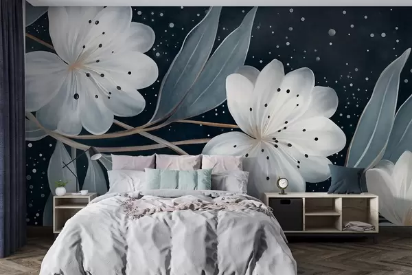 Fototapet Flori albe cu textură fantastică, înconjurate de frunze și ramuri albastru-verzui pe un fundal întunecat Nr. w09551