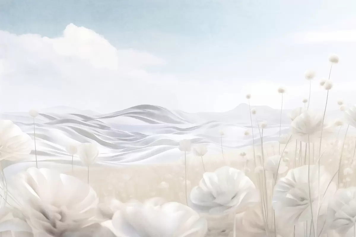 Fototapet Câmp texturat de maci cremoși cu dealuri ondulate sub un cer albastru pal cu nori moi, culori pastelate Nr. w09553