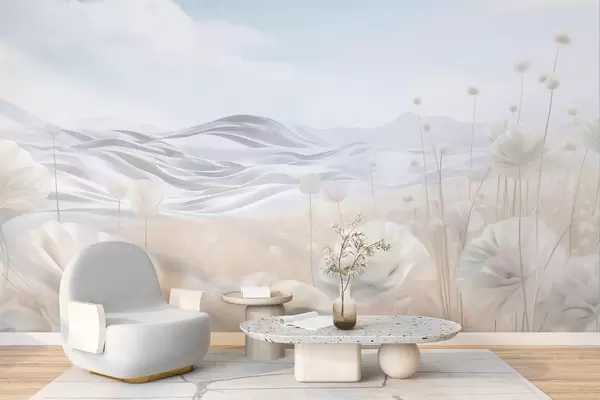 Fototapet Câmp texturat de maci cremoși cu dealuri ondulate sub un cer albastru pal cu nori moi, culori pastelate Nr. w09553
