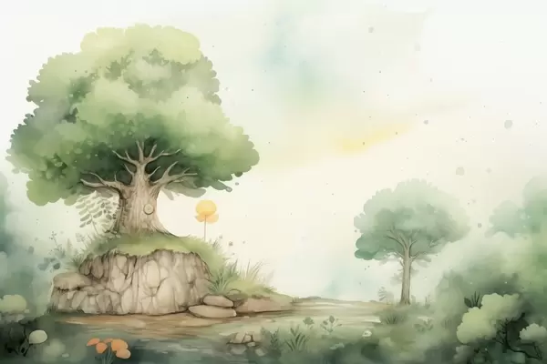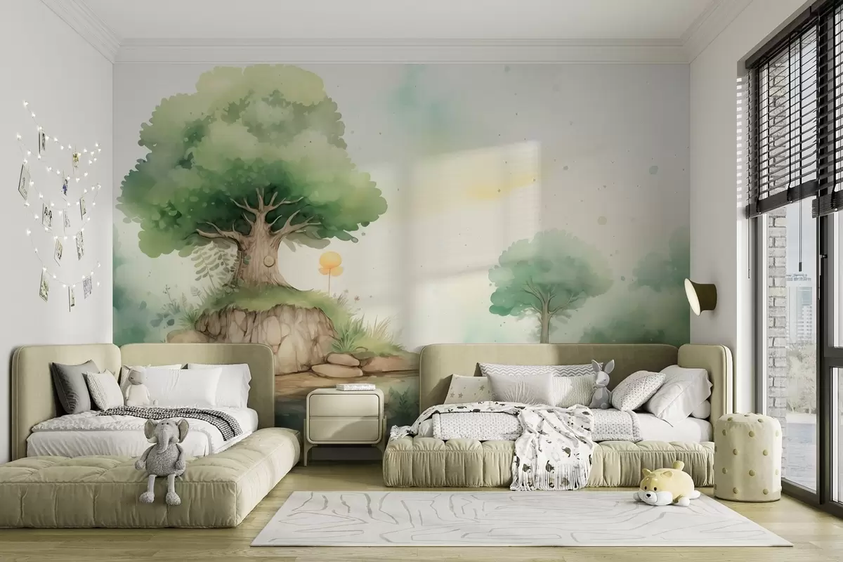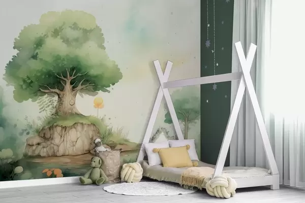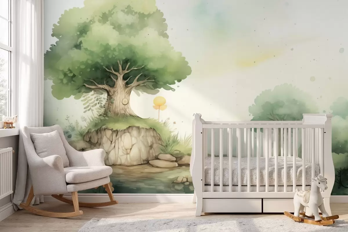 Fototapet O lume de basm a copilăriei într-un peisaj forestier verde, în stil acuarelă Nr. w09566