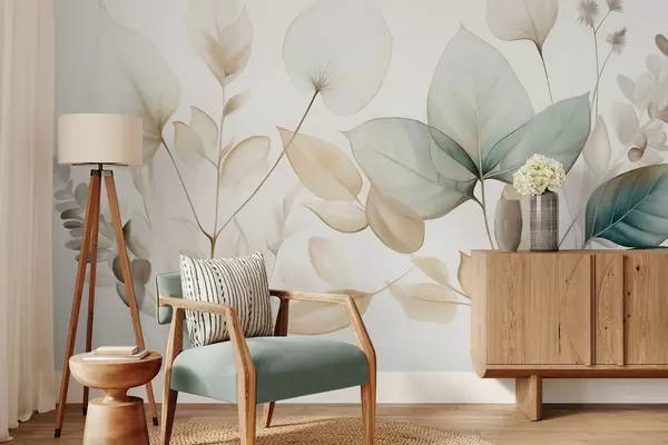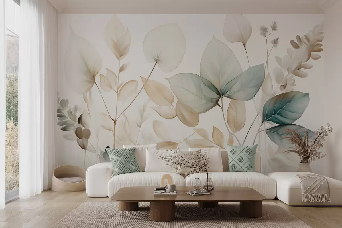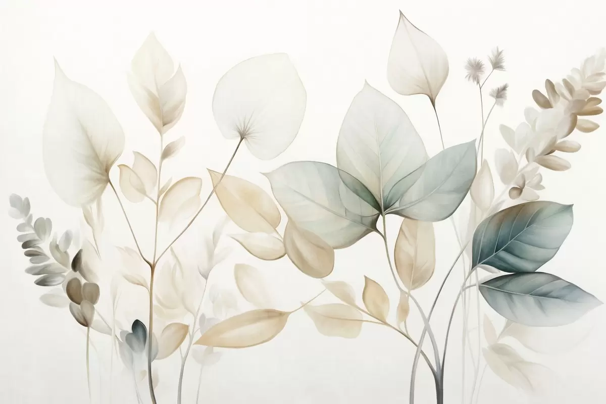 Fototapet Frunze translucide texturate în nuanțe discrete de bej și verde-albastru, cu tulpini delicate pe un fundal moale și deschis Nr. w09583