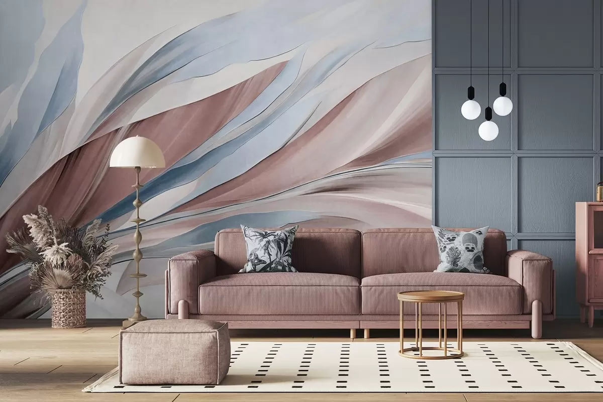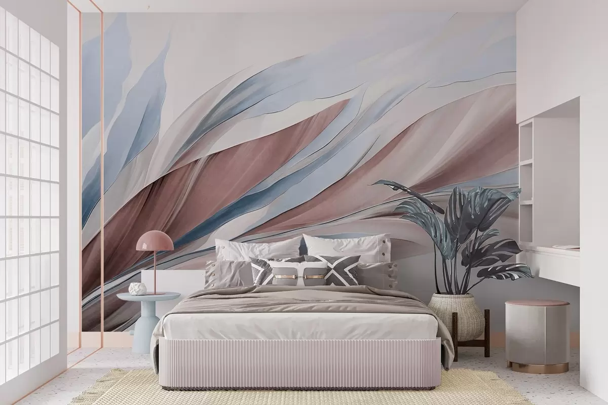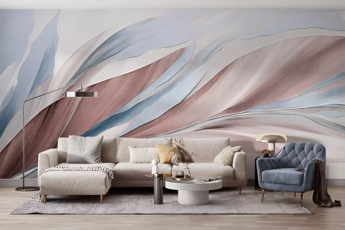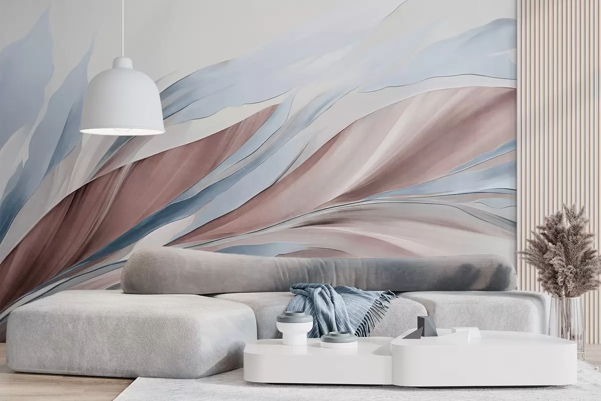 Fototapet Valuri abstracte albastre și maro, cu forme și linii subțiri, pe un fundal alb, artă texturată Nr. w09585v1