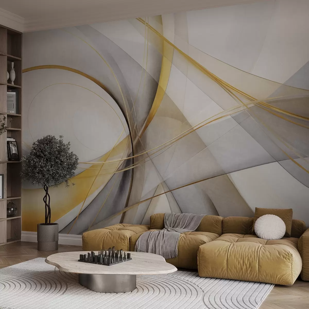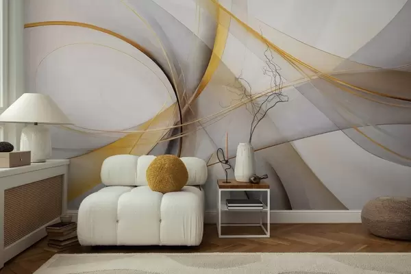 Fototapet Linii abstracte fluide în galben și alb pe un fundal gri, cu un sentiment de mișcare și profunzime, artă modernă Nr. w09587