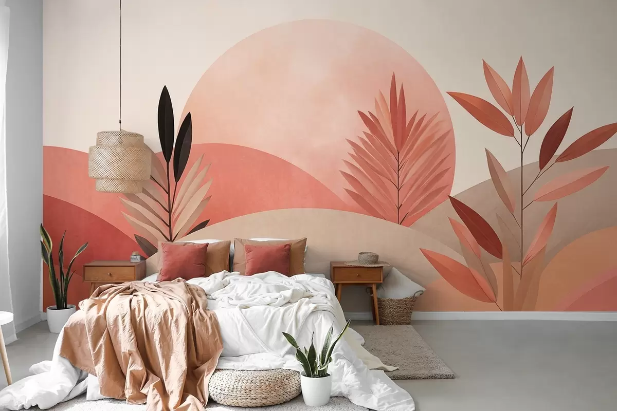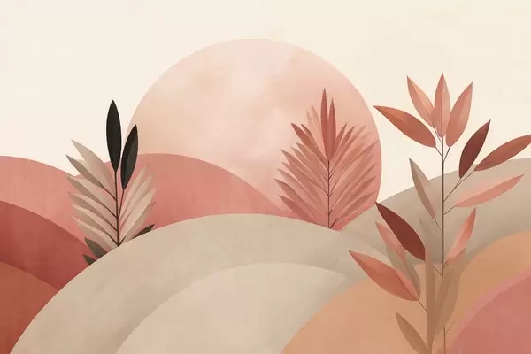 Fototapet Peisaj abstract în stil boho, soare în spatele dealurilor ondulate, plante în prim-plan, minimalist, texturat, culori discrete Nr. w09608