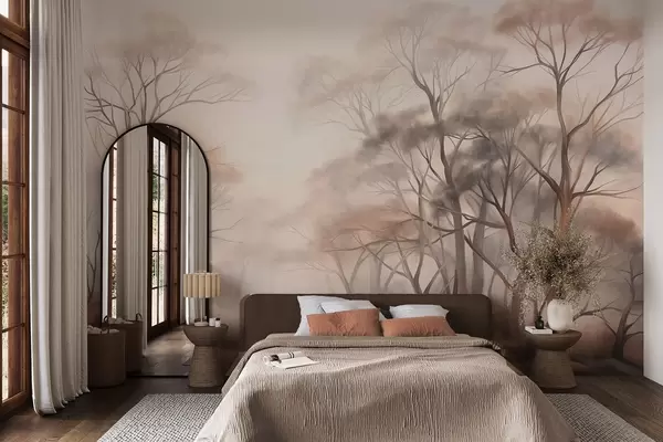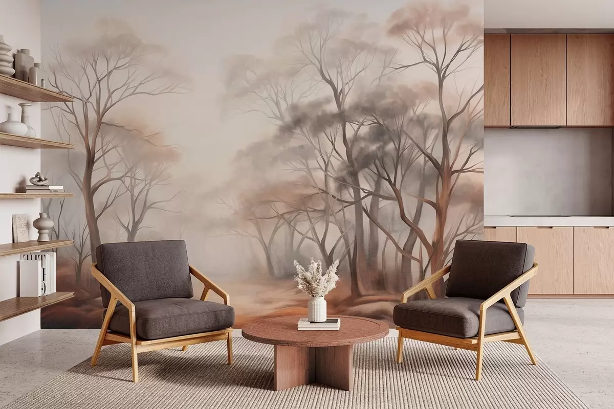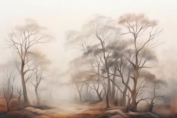 Fototapet Copaci texturați într-o pădure încețoșată, peisaj încețoșat cu culori discrete și lumină blândă Nr. w09609