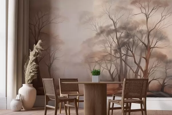Fototapet Copaci texturați într-o pădure încețoșată, peisaj încețoșat cu culori discrete și lumină blândă Nr. w09609
