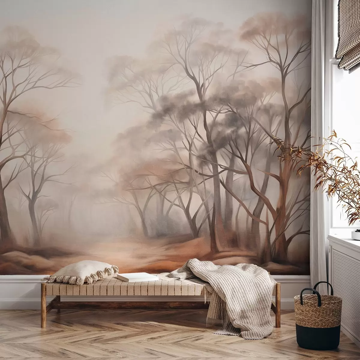 Fototapet Copaci texturați într-o pădure încețoșată, peisaj încețoșat cu culori discrete și lumină blândă Nr. w09609