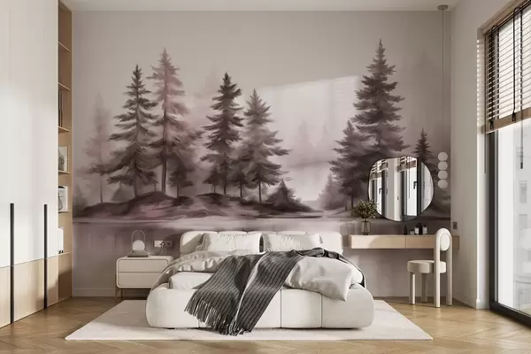 Fototapet O pădure încețoșată, cu textură, cu pini înalți, pictată în stil imitație Nr. w09610v1
