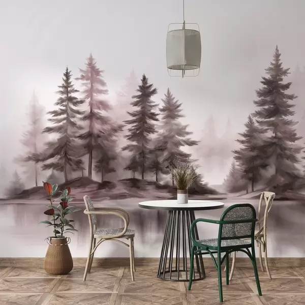 Fototapet O pădure încețoșată, cu textură, cu pini înalți, pictată în stil imitație Nr. w09610v1