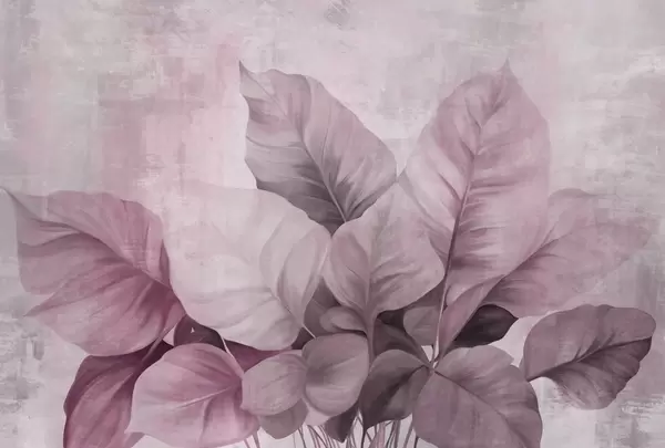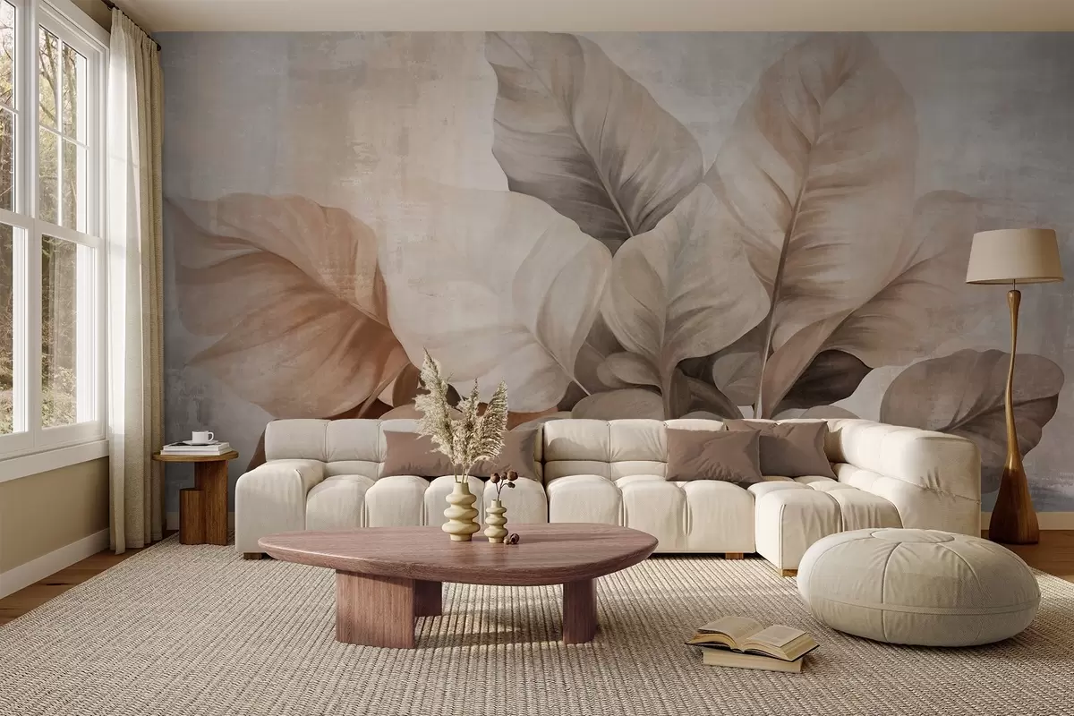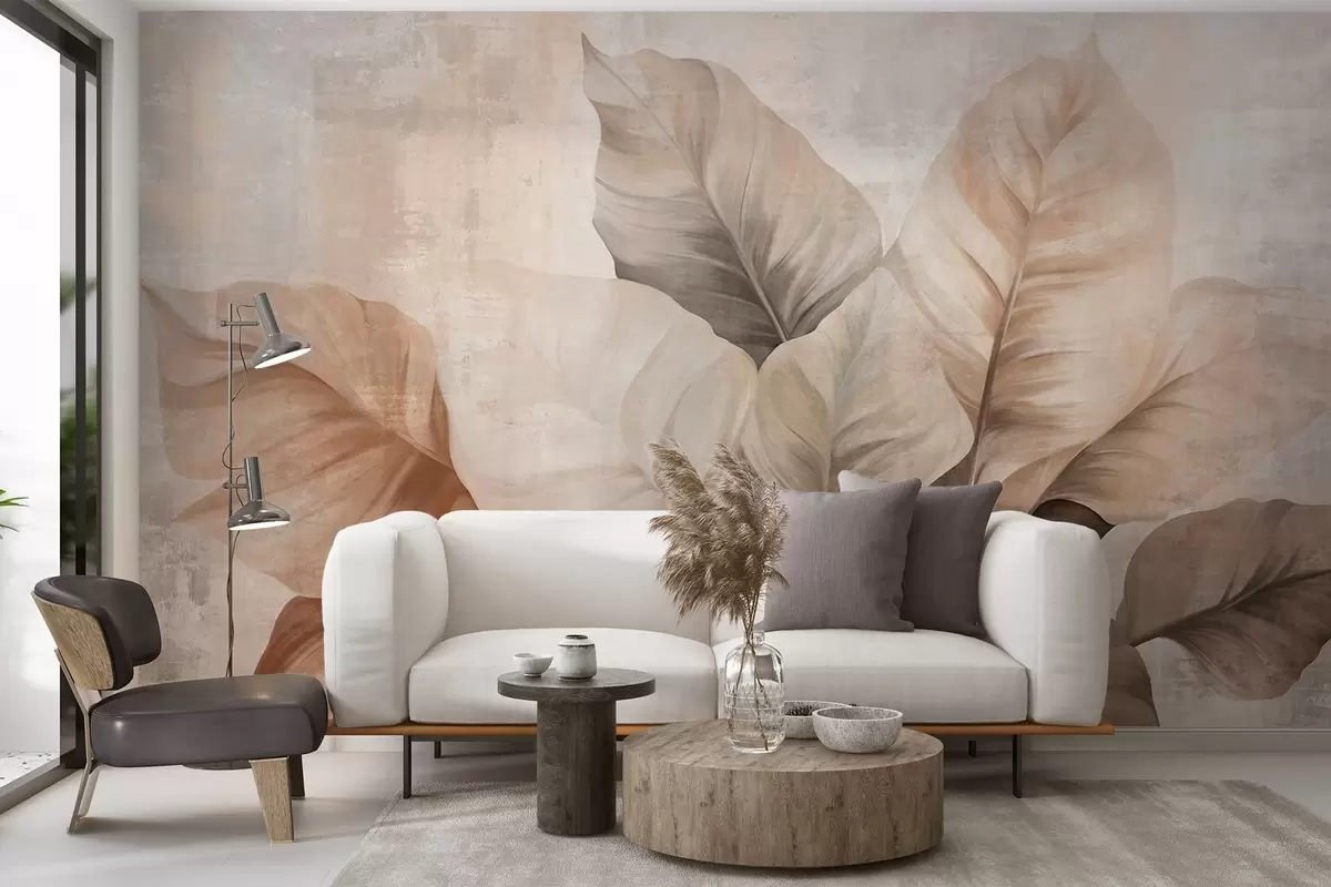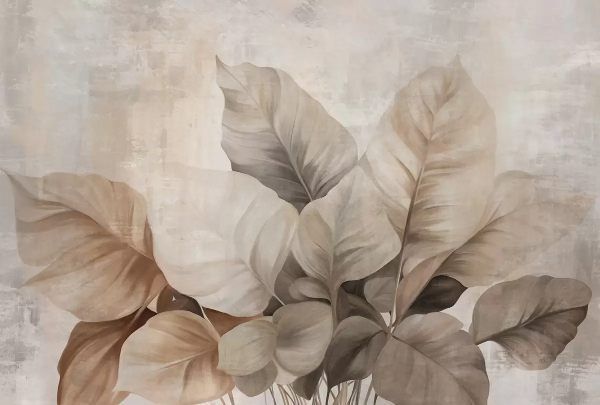 Fototapet Pictură texturată imitând frunze mari, de culoare maro deschis, pe un fundal neutru, cu tușe subtile de pensulă. Nr. w09614