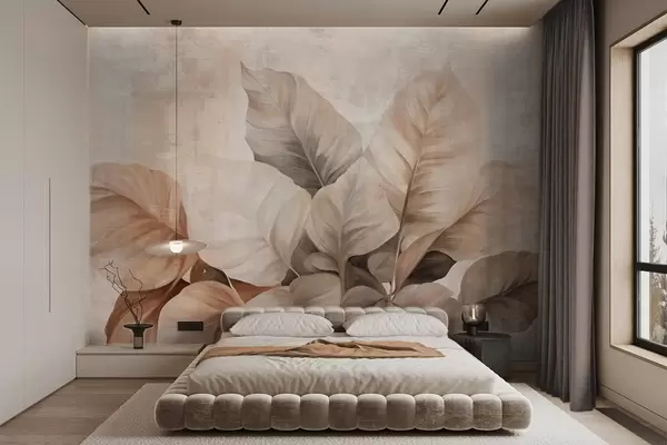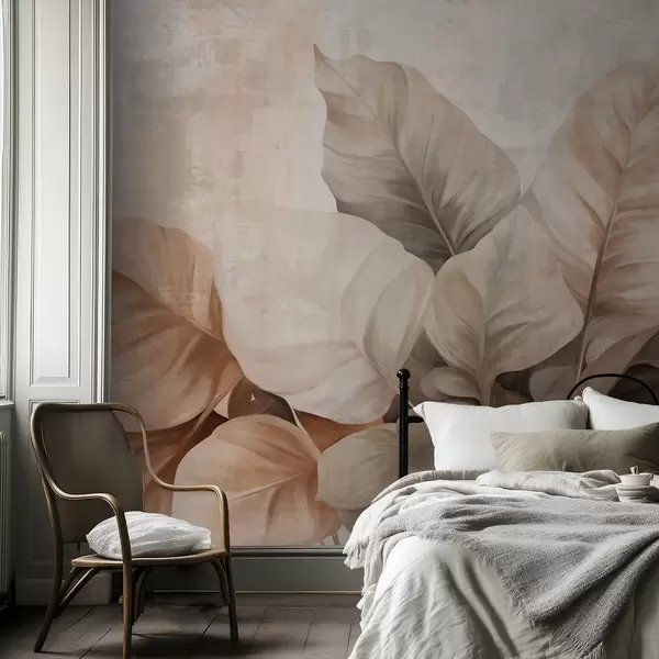 Fototapet Pictură texturată imitând frunze mari, de culoare maro deschis, pe un fundal neutru, cu tușe subtile de pensulă. Nr. w09614