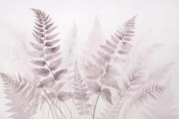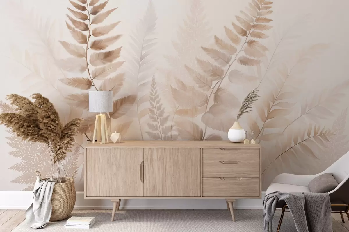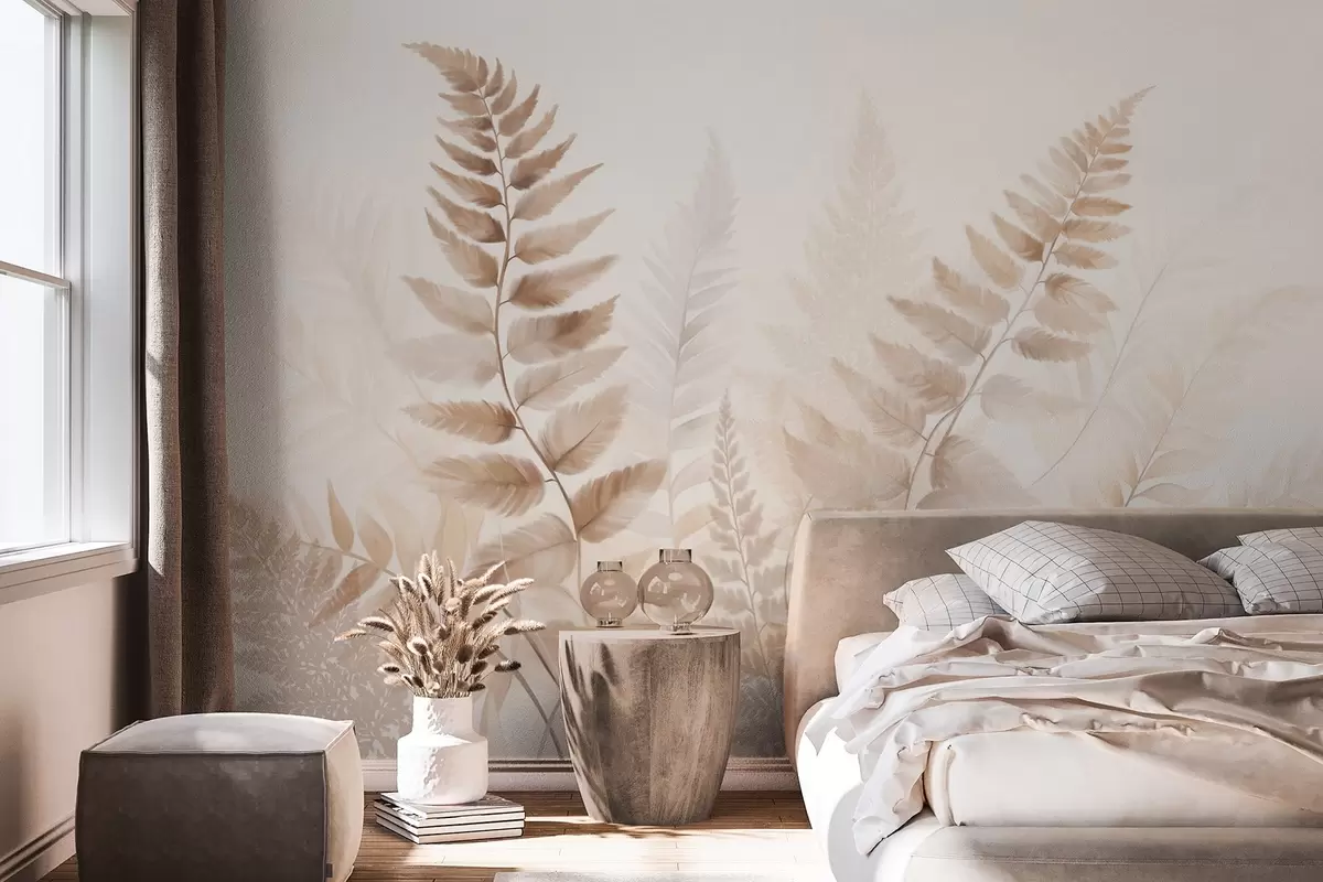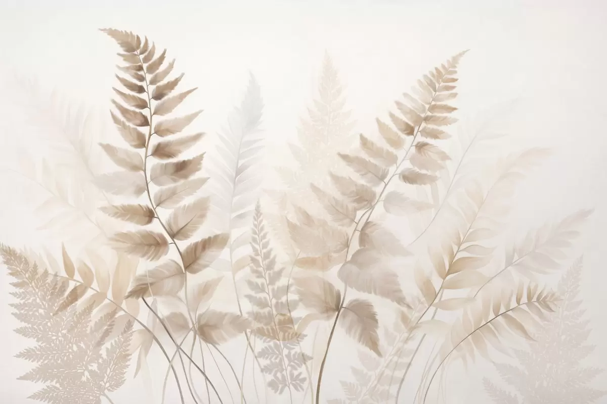 Fototapet Frunze de ferigă uscate, texturate, în diferite nuanțe de maro, cu un fundal moale și deschis, în stil acuarelă. Nr. w09615
