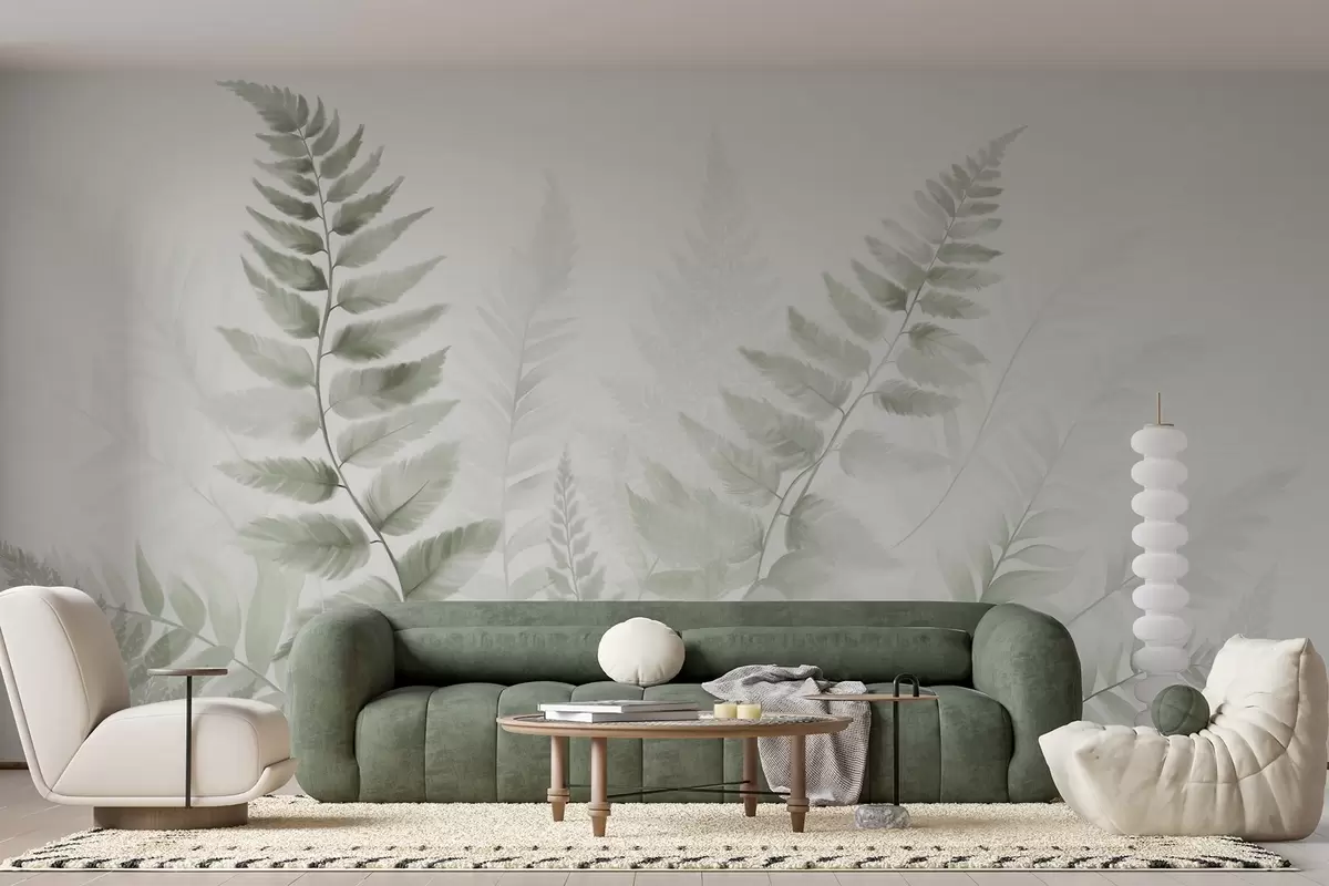Fototapet Frunze de ferigă uscate, texturate, în diferite nuanțe de verde, pe un fundal moale și deschis, în stil acuarelă. Nr. w09615v1
