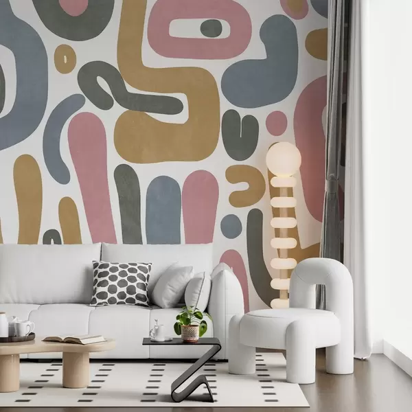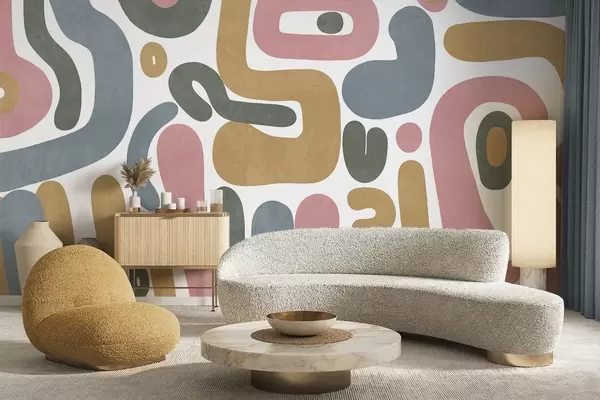 Fototapet Forme abstracte texturate în roz pastel, albastru discret, galben muștar și gri pe fond alb artă modernă Nr. w09620