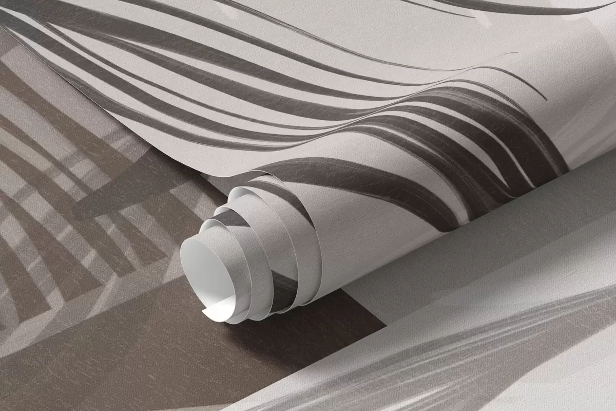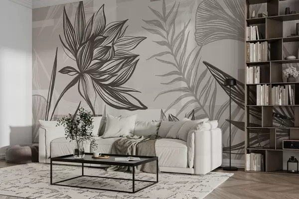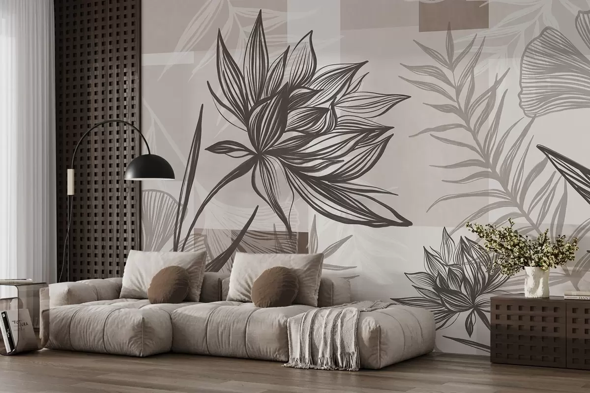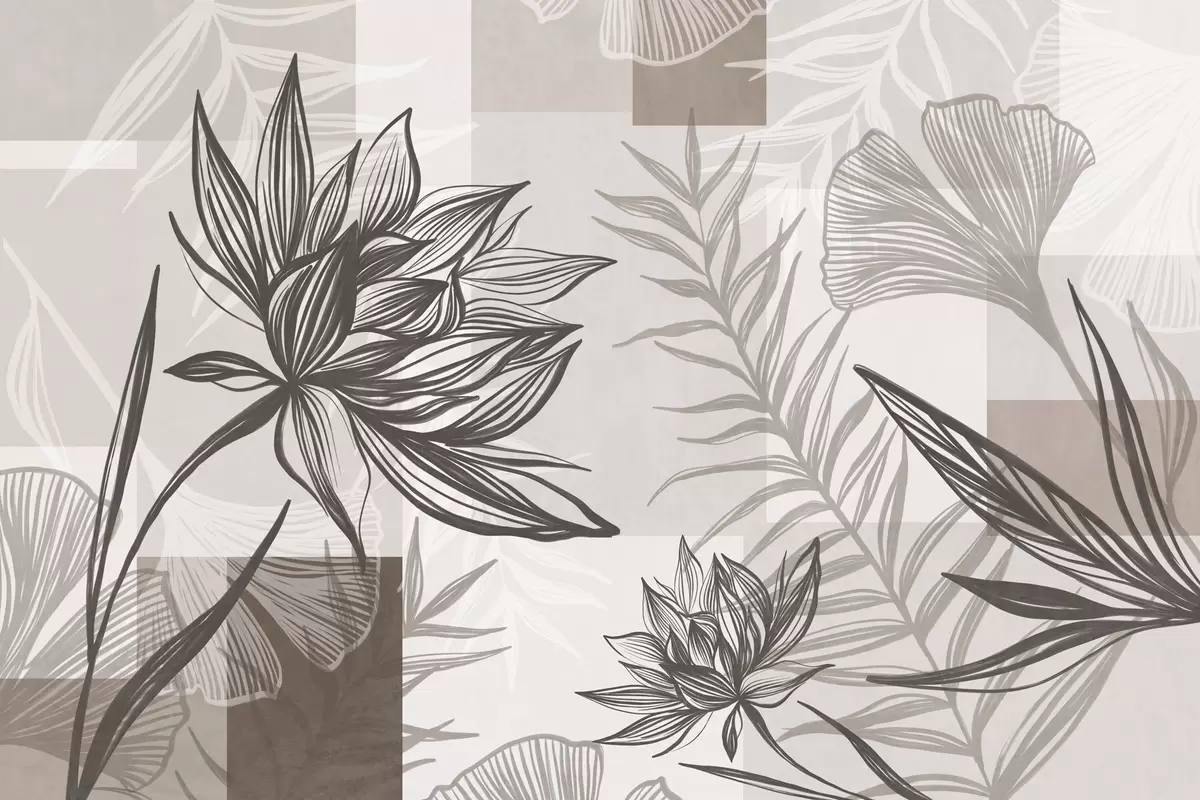 Fototapet Flori și frunze stilizate texturate în nuanțe de maro și bej, cu fundal geometric, artă liniară Nr. w09629