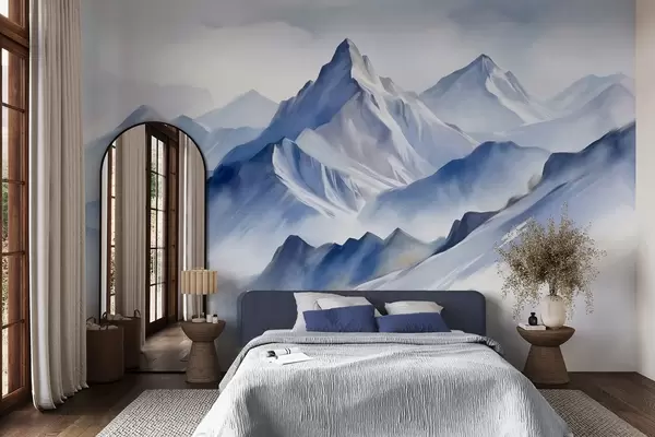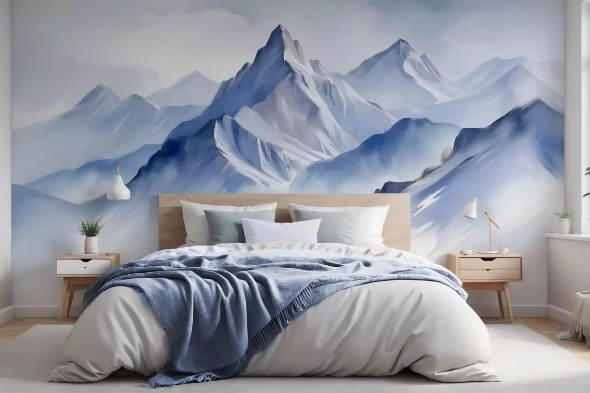 Fototapet Munți înzăpeziți texturați, cu un efect delicat de acuarelă și o paletă de culori albastru și alb Nr. w09630