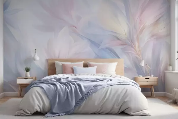Fototapet Frunze moi, în culori pastelate, și pene în nuanțe de roz, albastru și galben, imprimeu abstract și texturat Nr. w09634