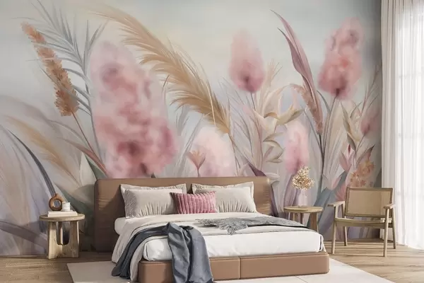 Fototapet Iarbă pampas roz și bej și alte flori uscate, cu un cer moale și încețoșat în fundal Nr. w09635