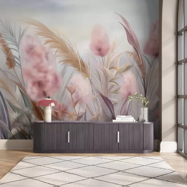 Fototapet Iarbă pampas roz și bej și alte flori uscate, cu un cer moale și încețoșat în fundal Nr. w09635
