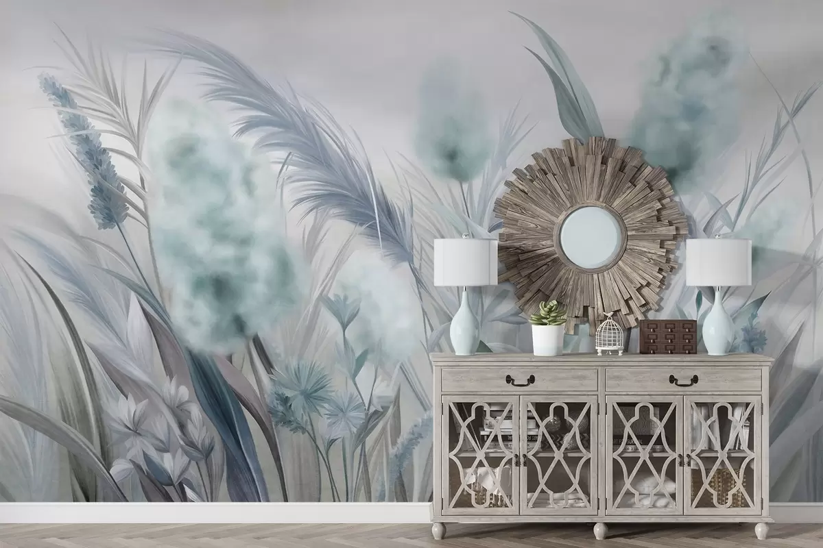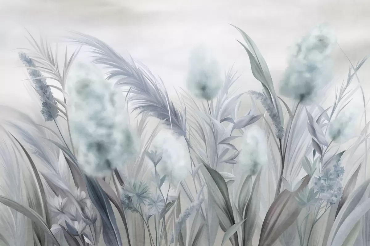 Fototapet Iarbă pampas albastră și gri și alte flori uscate, cu un cer moale și încețoșat în fundal Nr. w09635v1