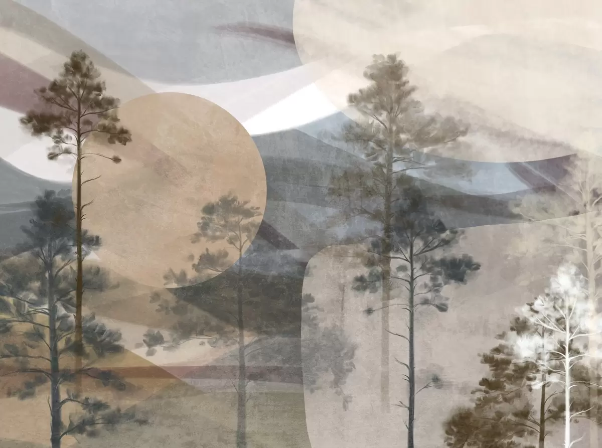 Fototapet Pini înalți într-un peisaj texturat, cu forme circulare abstracte și munți stratificați în tonuri pământii Nr. w09636