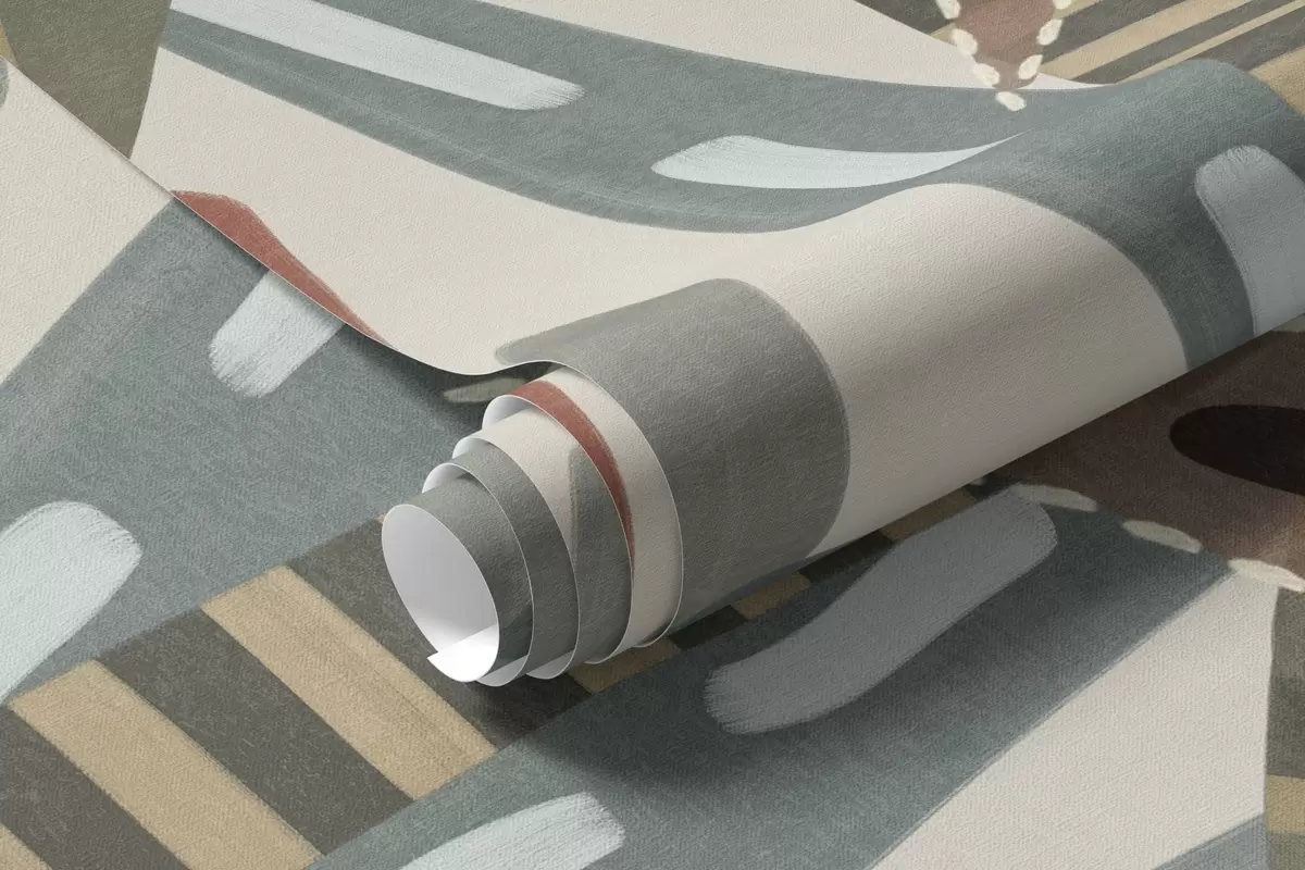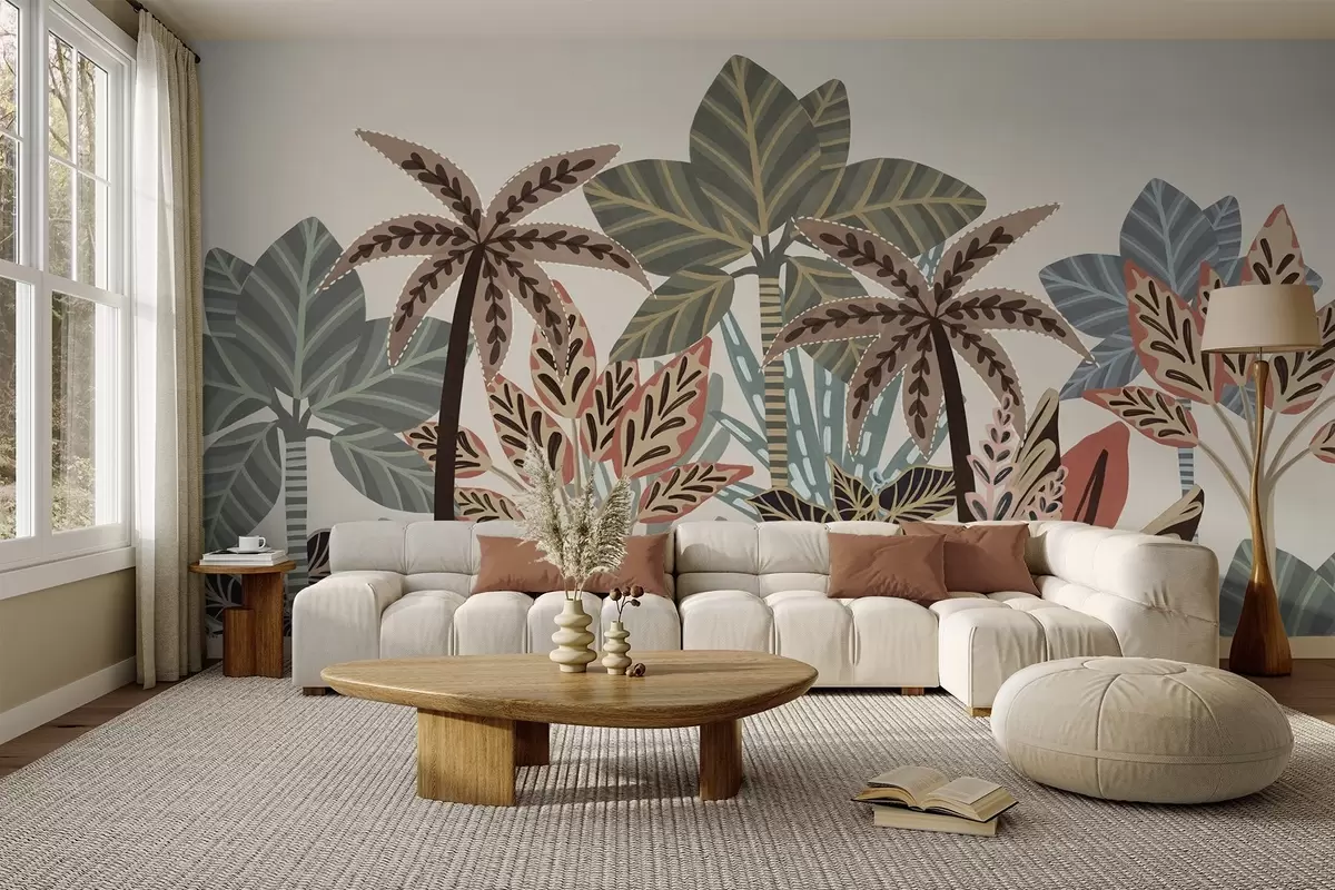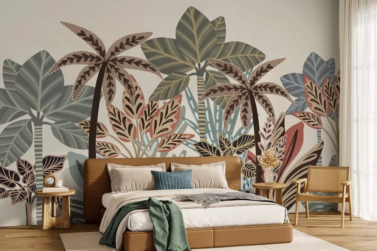 Fototapet Plante tropicale texturate și palmieri cu culori discrete în stil boho decorativ pe un fundal crem Nr. w09639