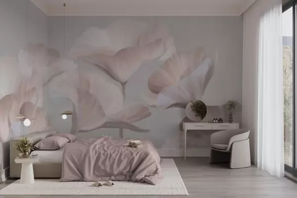 Fototapet Flori de lotus translucide, de culoare piersică pal, cu textură și petale delicate, pe un fundal gri discret Nr. w09640