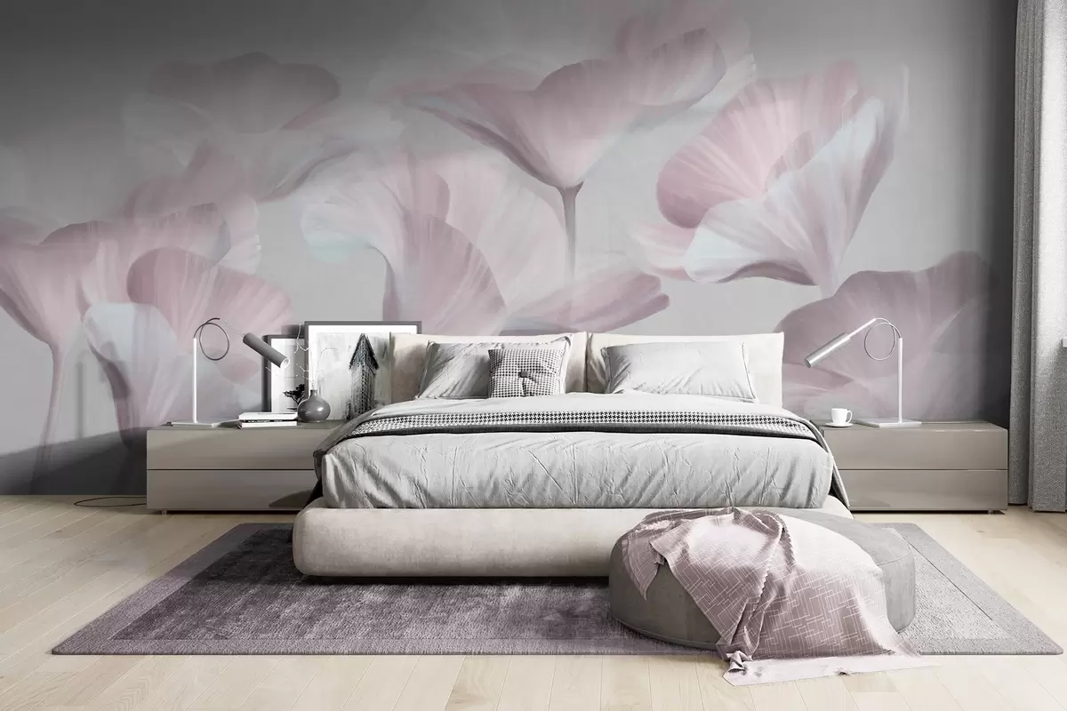 Fototapet Flori de lotus translucide, de culoare roz pal, cu textură și petale delicate, pe un fundal gri discret Nr. w09640v1