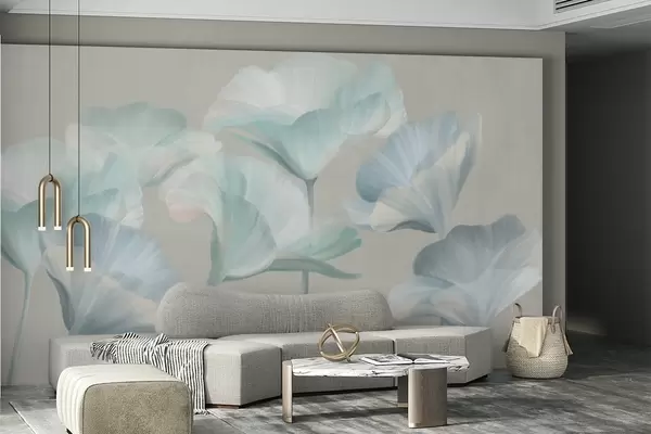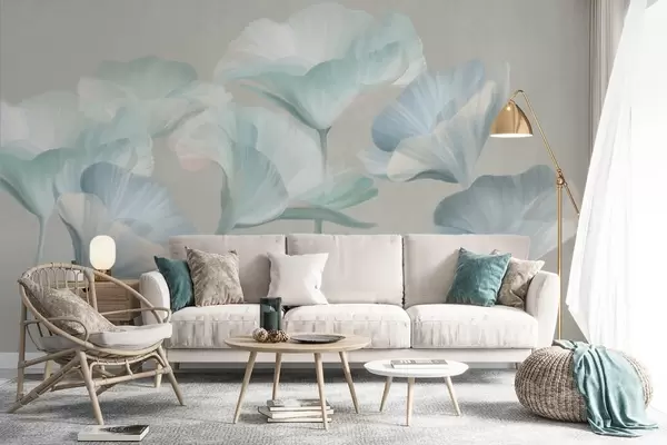 Fototapet Flori de lotus translucide, de culoare turcoaz pal, cu textură și petale delicate, pe un fundal gri discret Nr. w09640v2