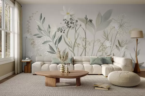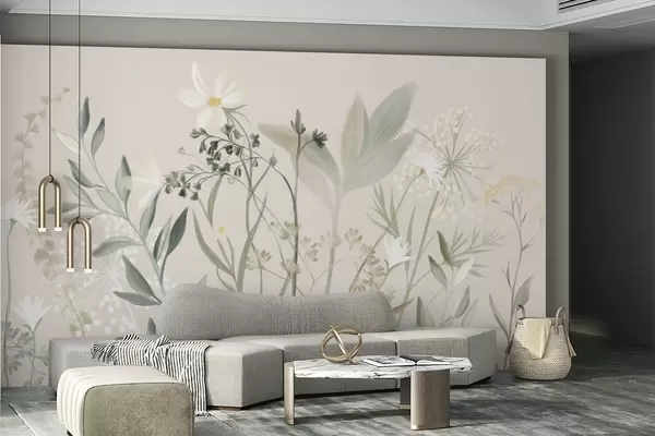 Fototapet Flori sălbatice și frunze cu textură delicată, în nuanțe discrete de verde și crem, pe un fundal bej deschis. Nr. w09641