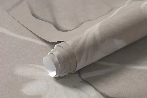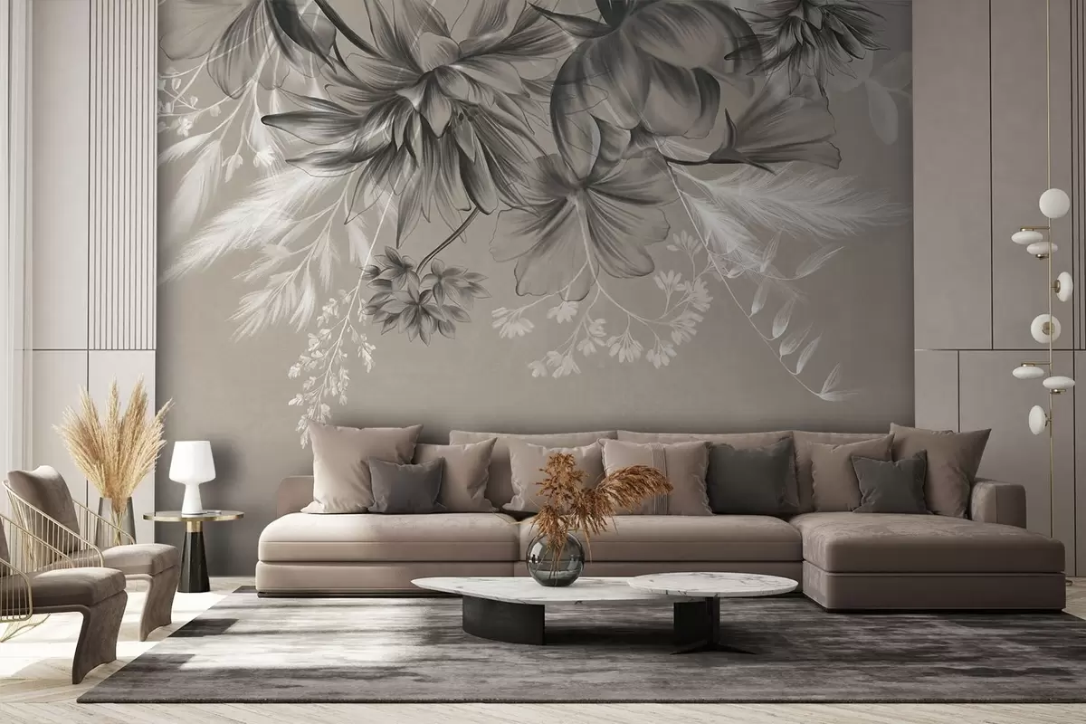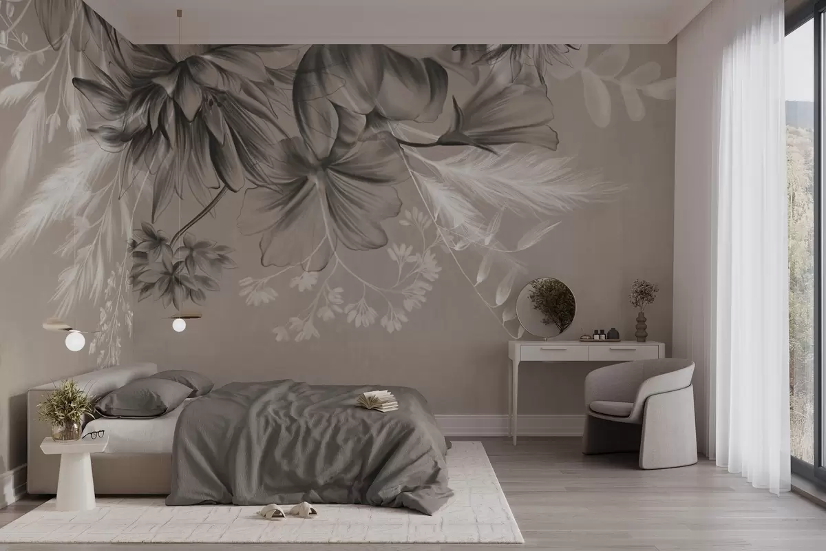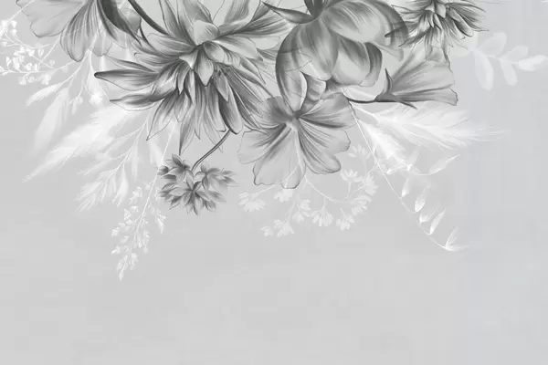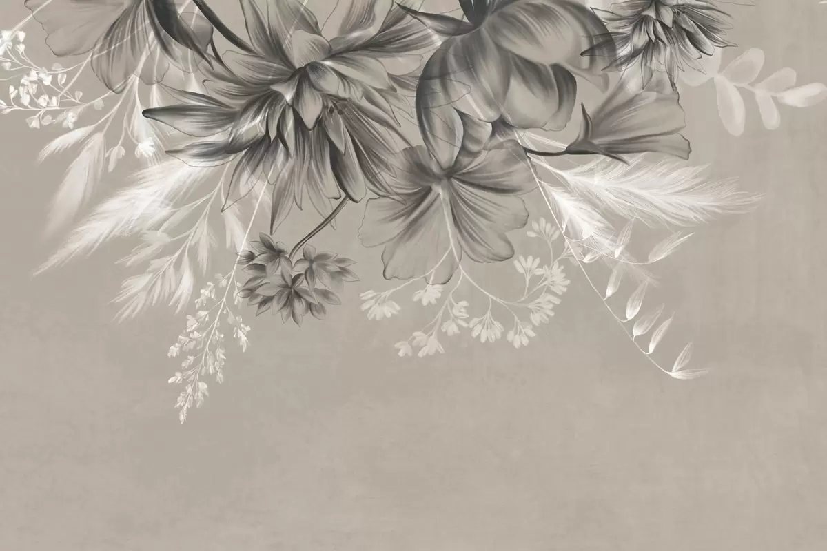 Fototapet Flori și ferigi texturate în nuanțe de gri închis și alb pe un fundal bej discret stil de desen Nr. w09644