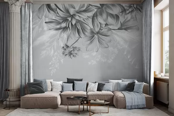 Fototapet Flori și ferigi texturate în nuanțe de gri închis și alb pe un fundal gri discret, stil de desen Nr. w09644v1