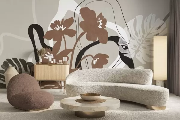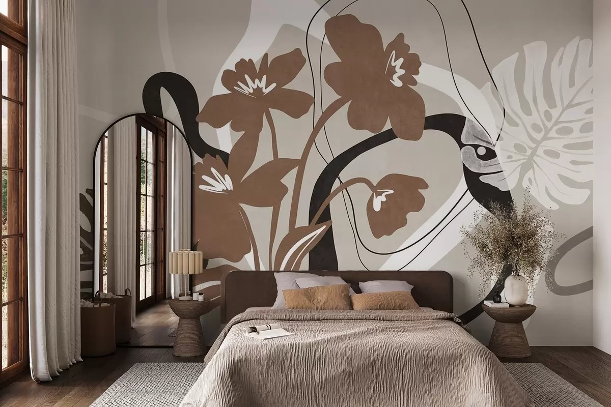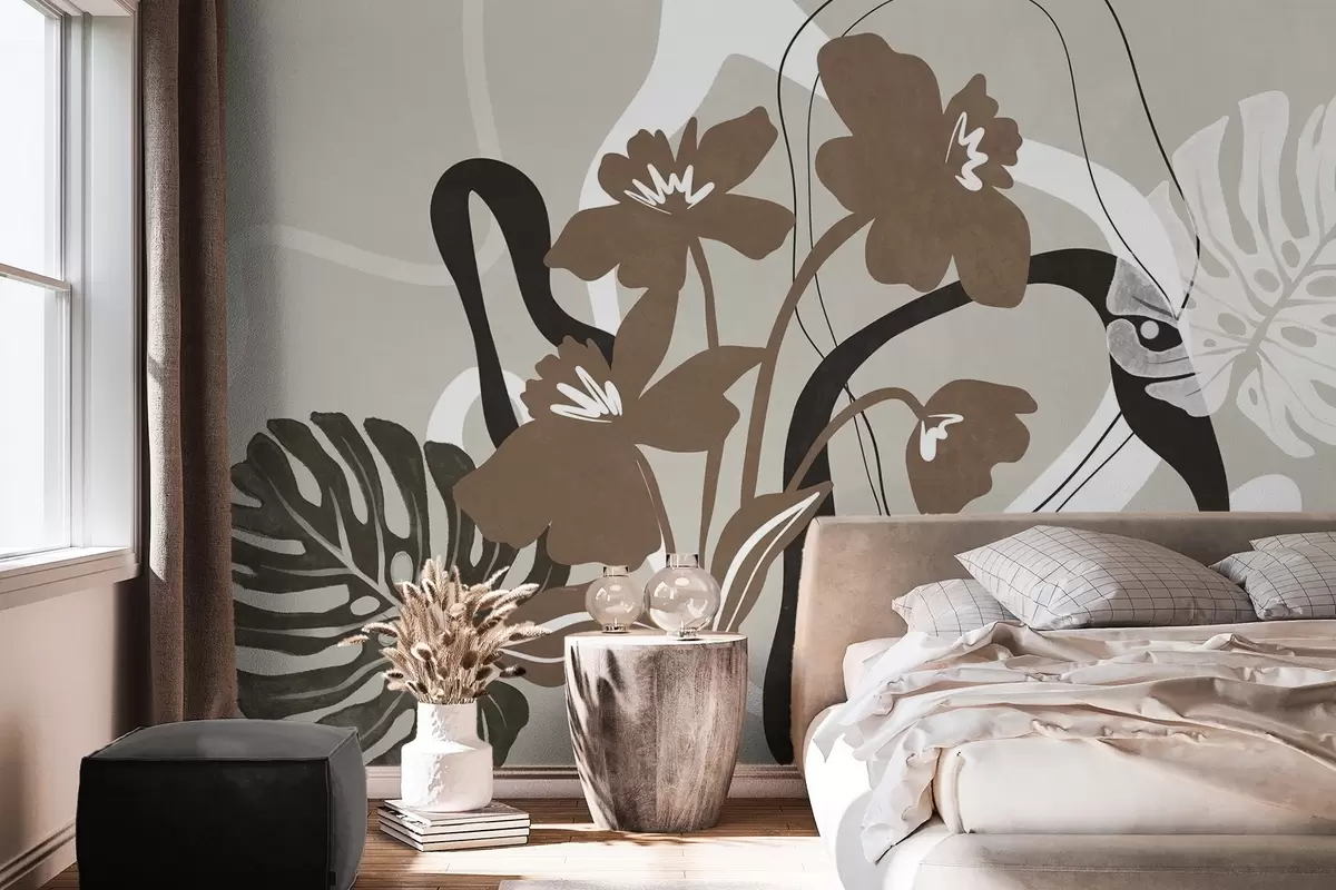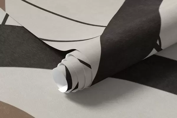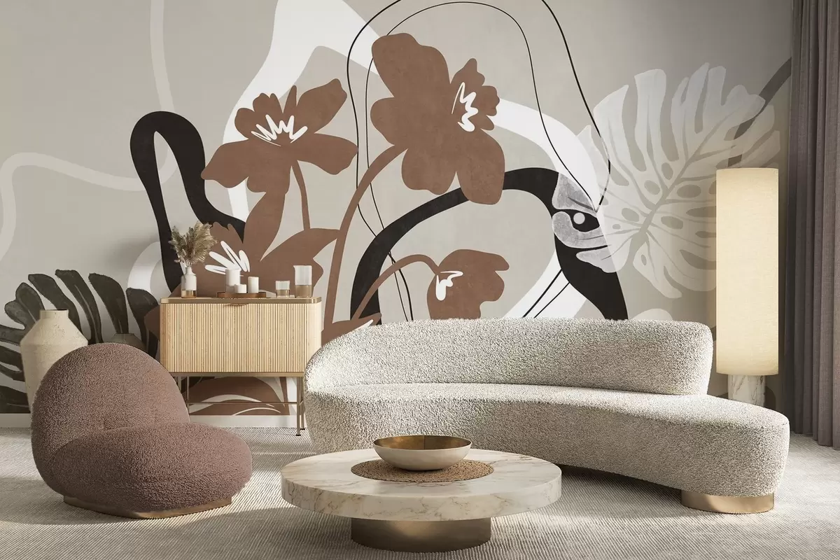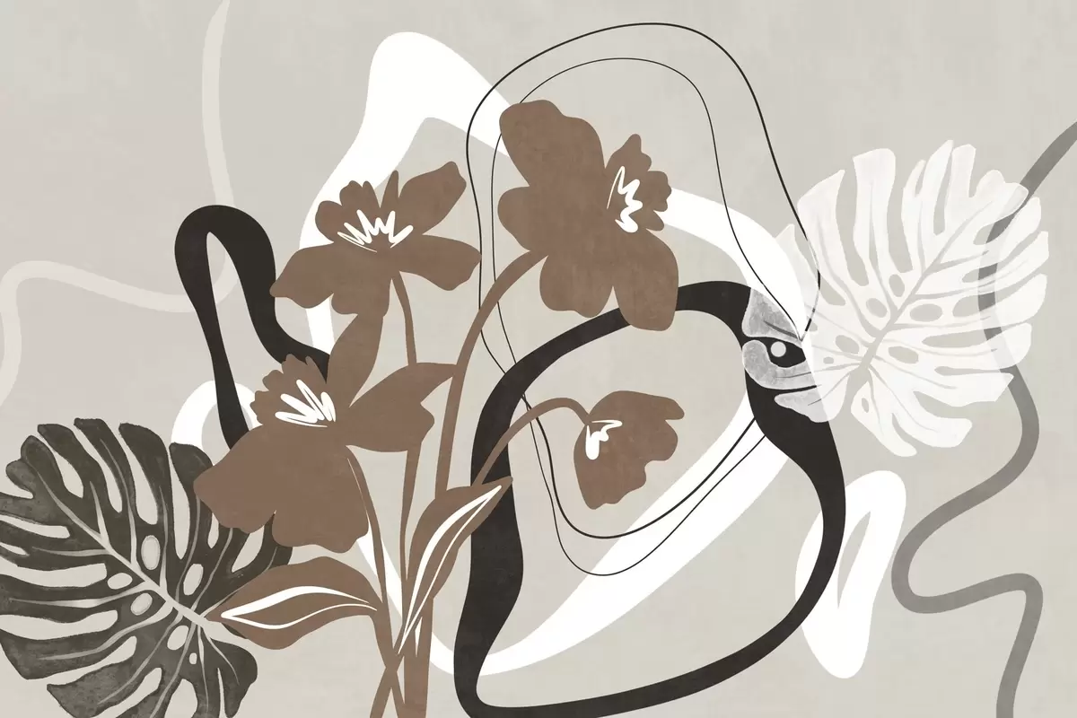 Fototapet Flori maro abstracte cu textură, cu forme albe și negre pe fond bej, artă minimalistă Nr. w09645v1