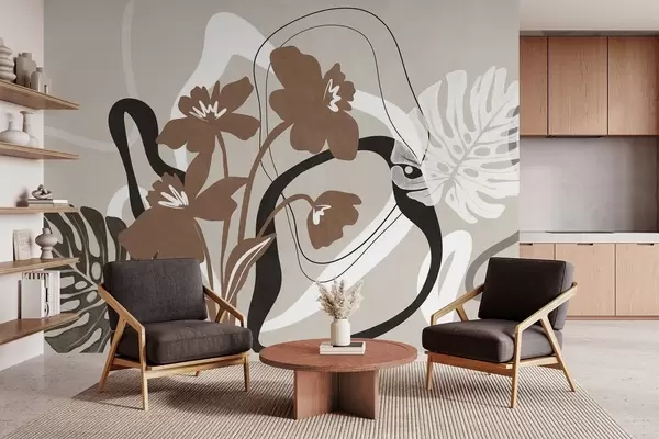 Fototapet Flori maro abstracte cu textură, cu forme albe și negre pe fond bej, artă minimalistă Nr. w09645v1