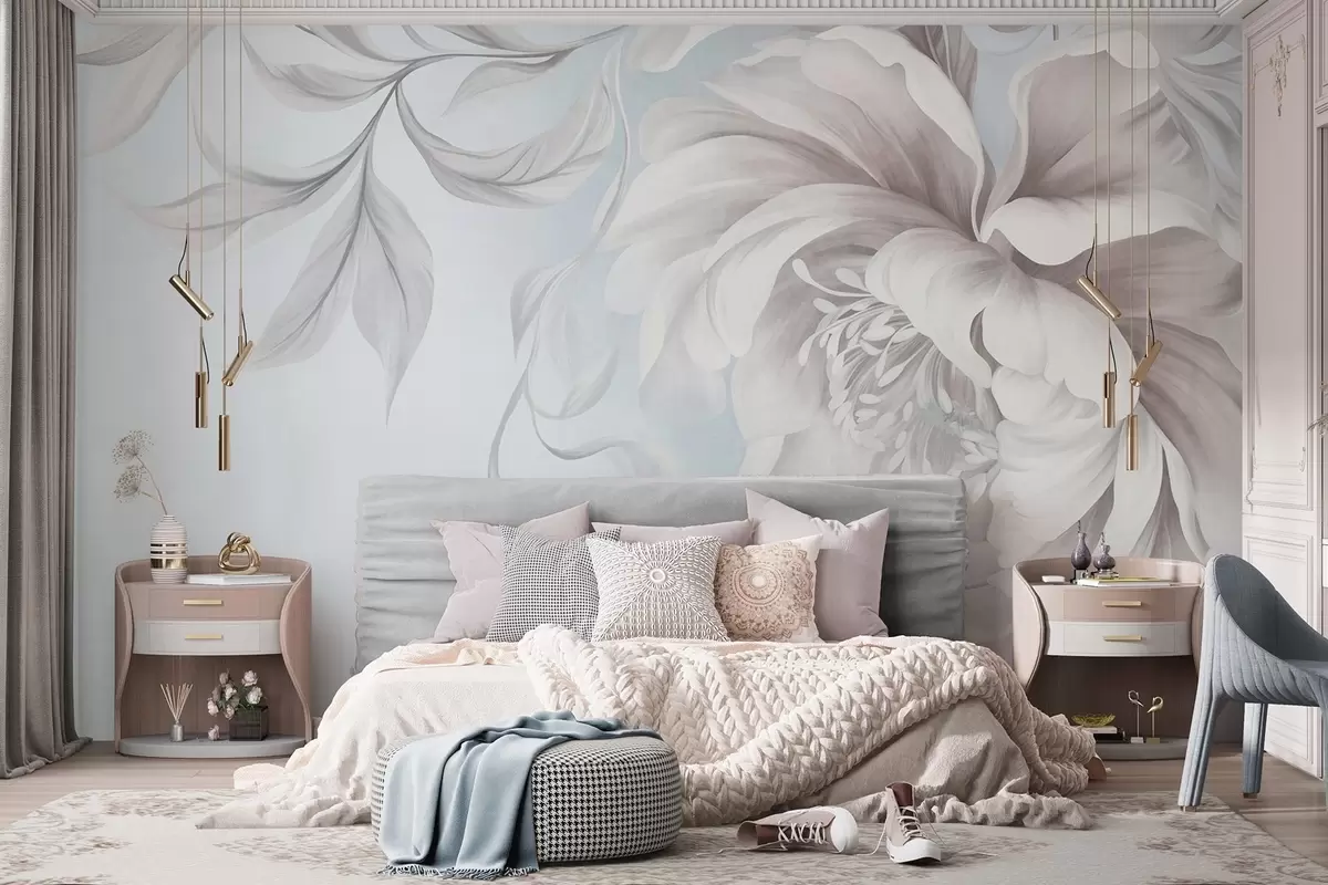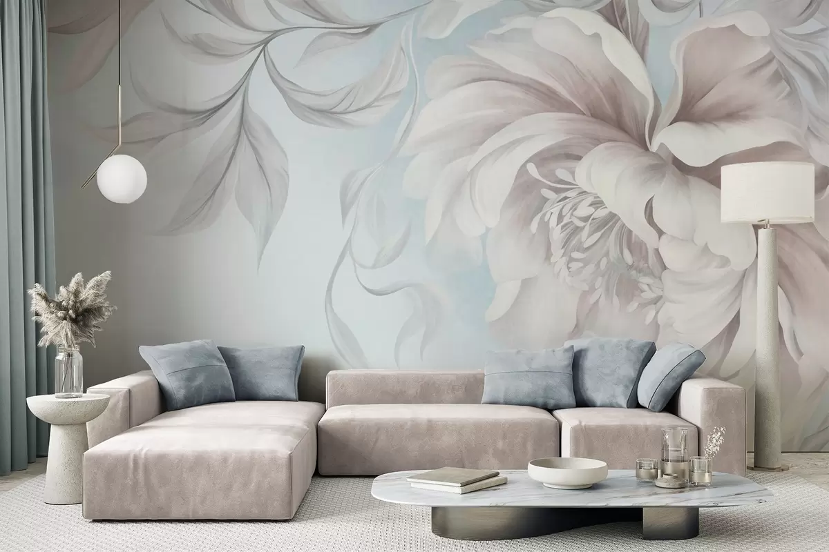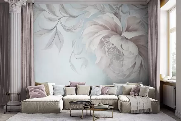 Fototapet Bujor mare, cu textură, cu petale delicate și frunze cenușii, pictat într-un stil delicat Nr. w09647v1