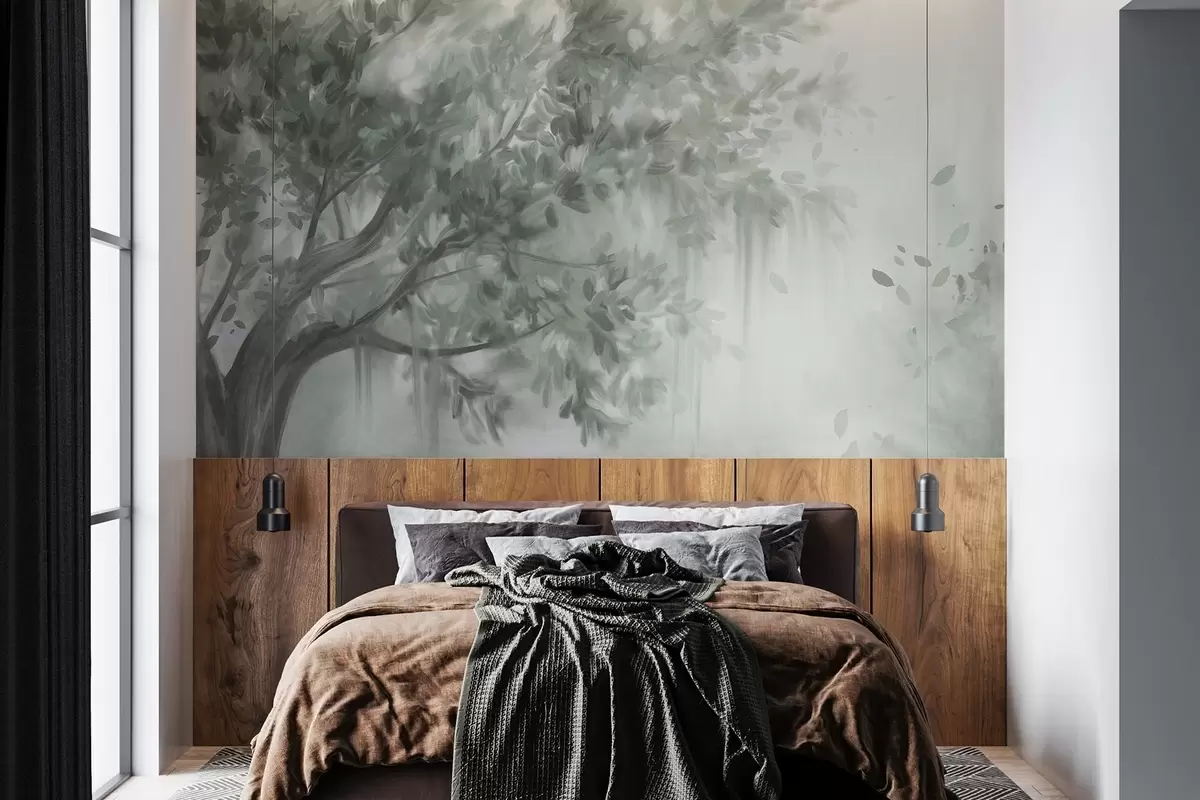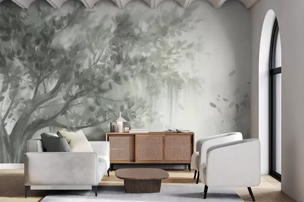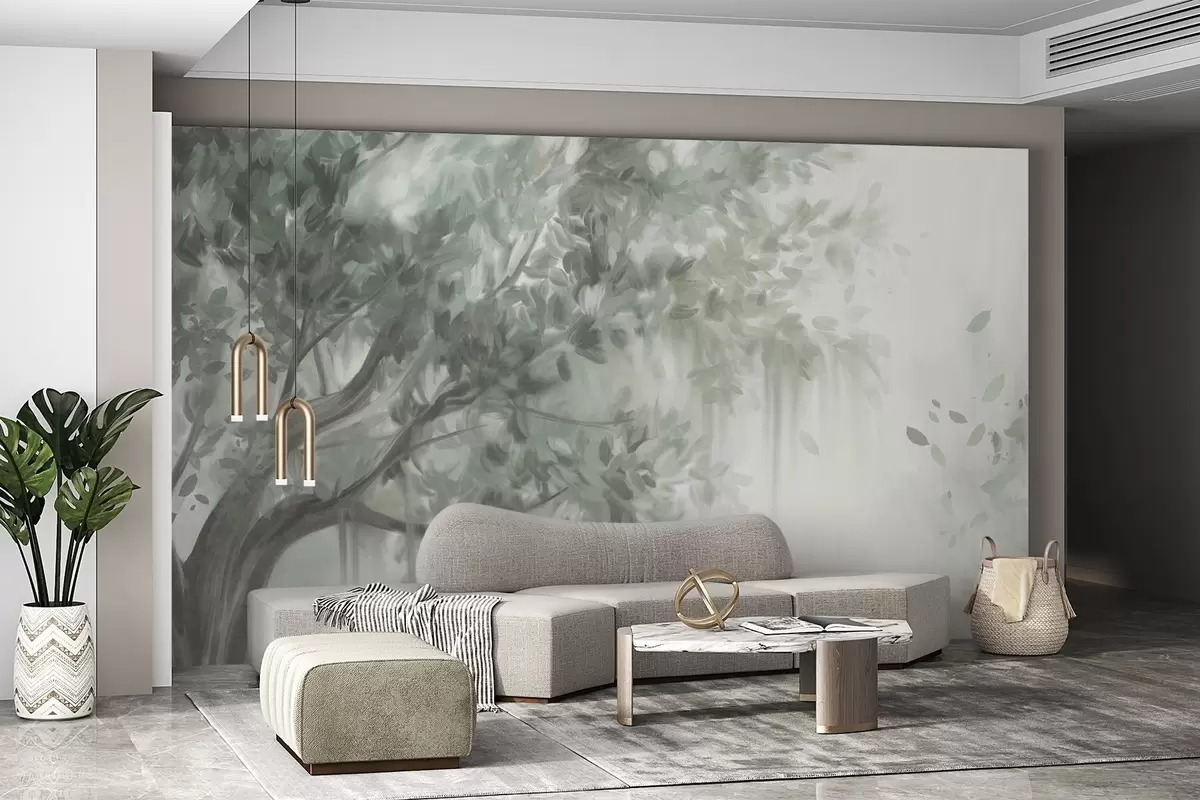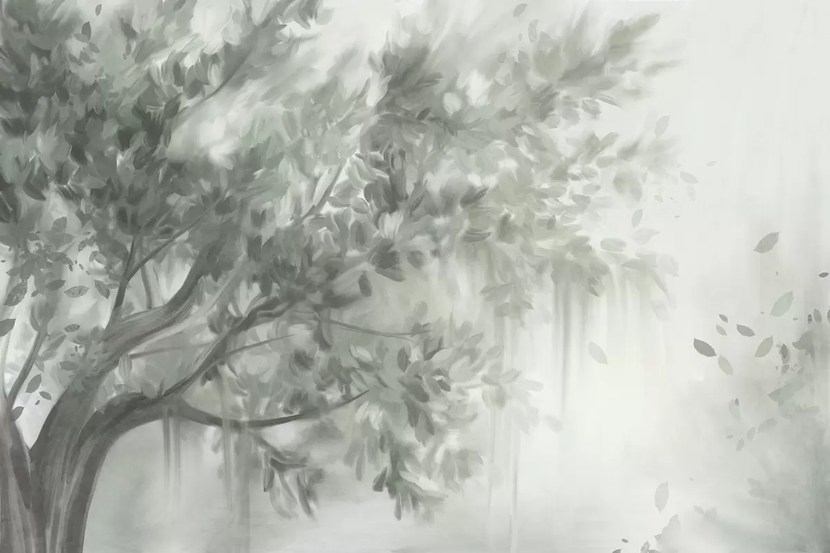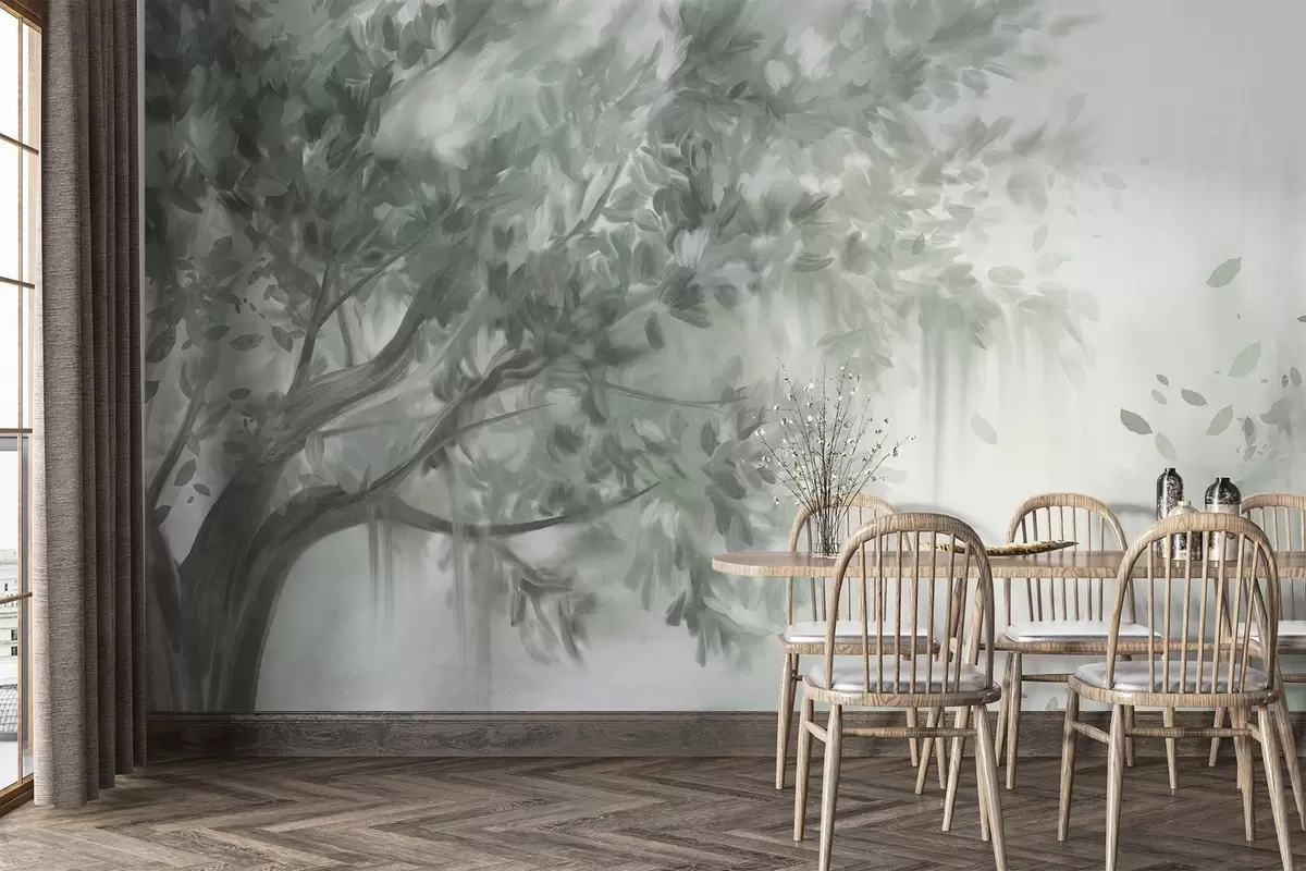 Fototapet Copac texturat cu frunze și ramuri verzi, cu un fundal moale și încețoșat Nr. w09650v1