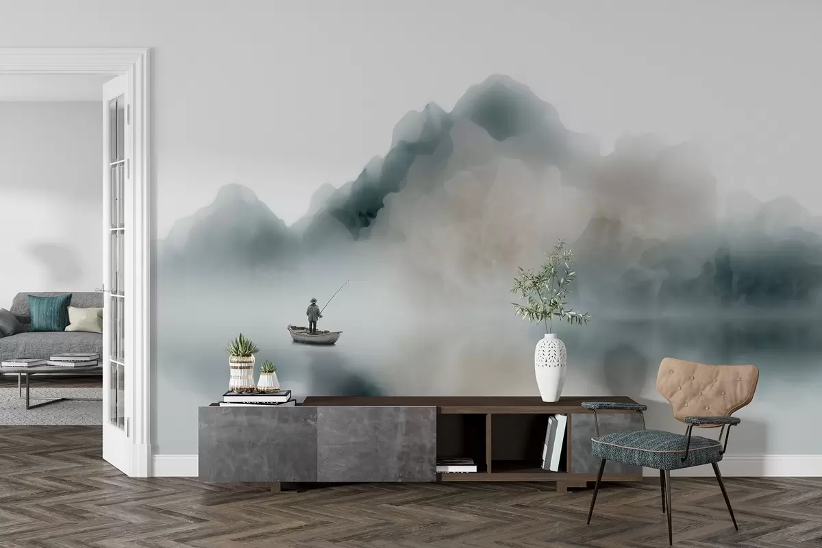 Fototapet Peisaj montan cu o barcă și un pescar care se pierd în ceața ușoară Nr. w09678