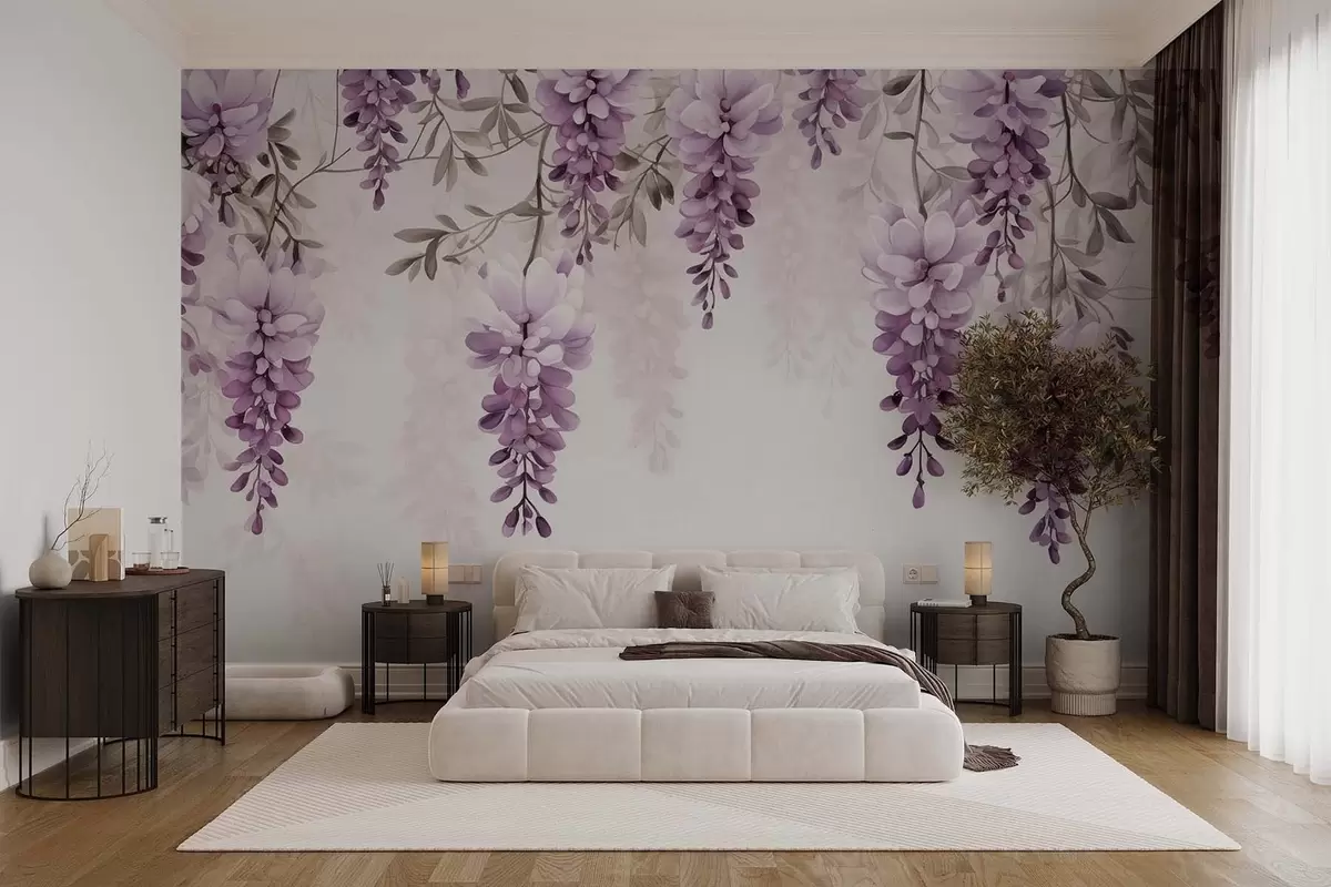 Fototapet Ramuri delicate și mari de lavandă atârnate pe perete, imitație de acuarelă Nr. w09690