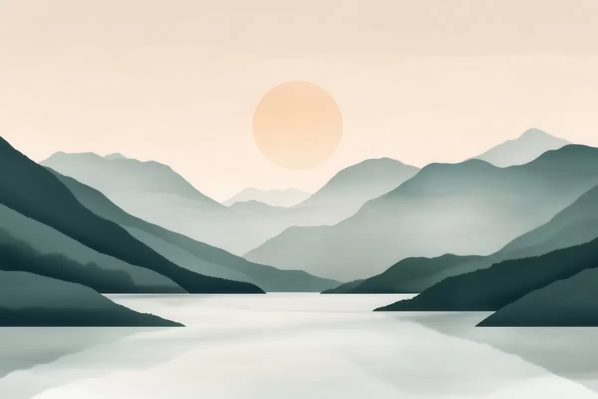 Fototapet Peisaj montan liniștit, cu soarele deasupra lacului Nr. w09735