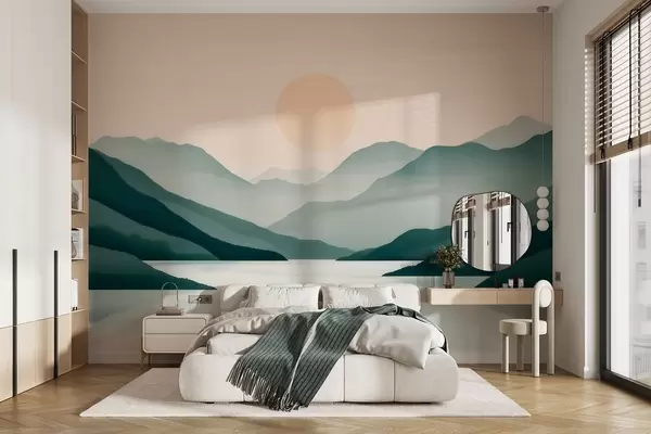 fototapet Peisaj montan liniștit, cu soarele deasupra lacului w09735