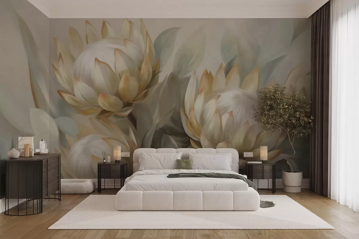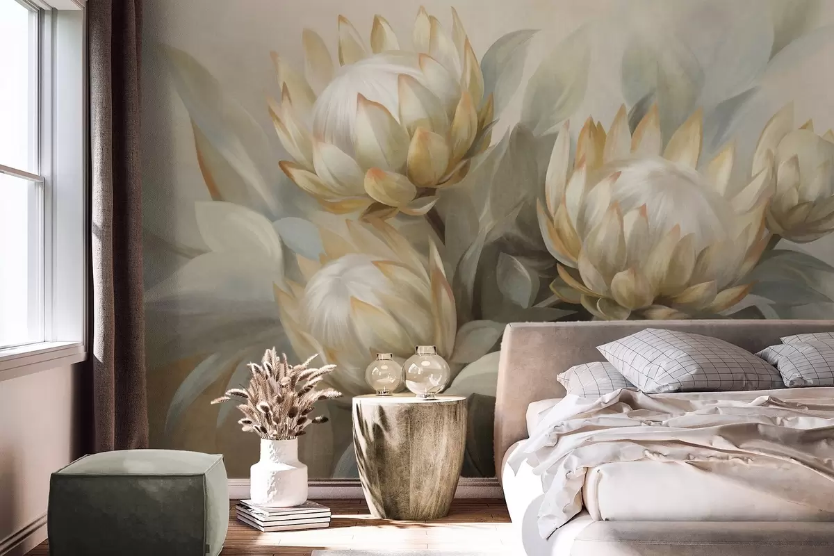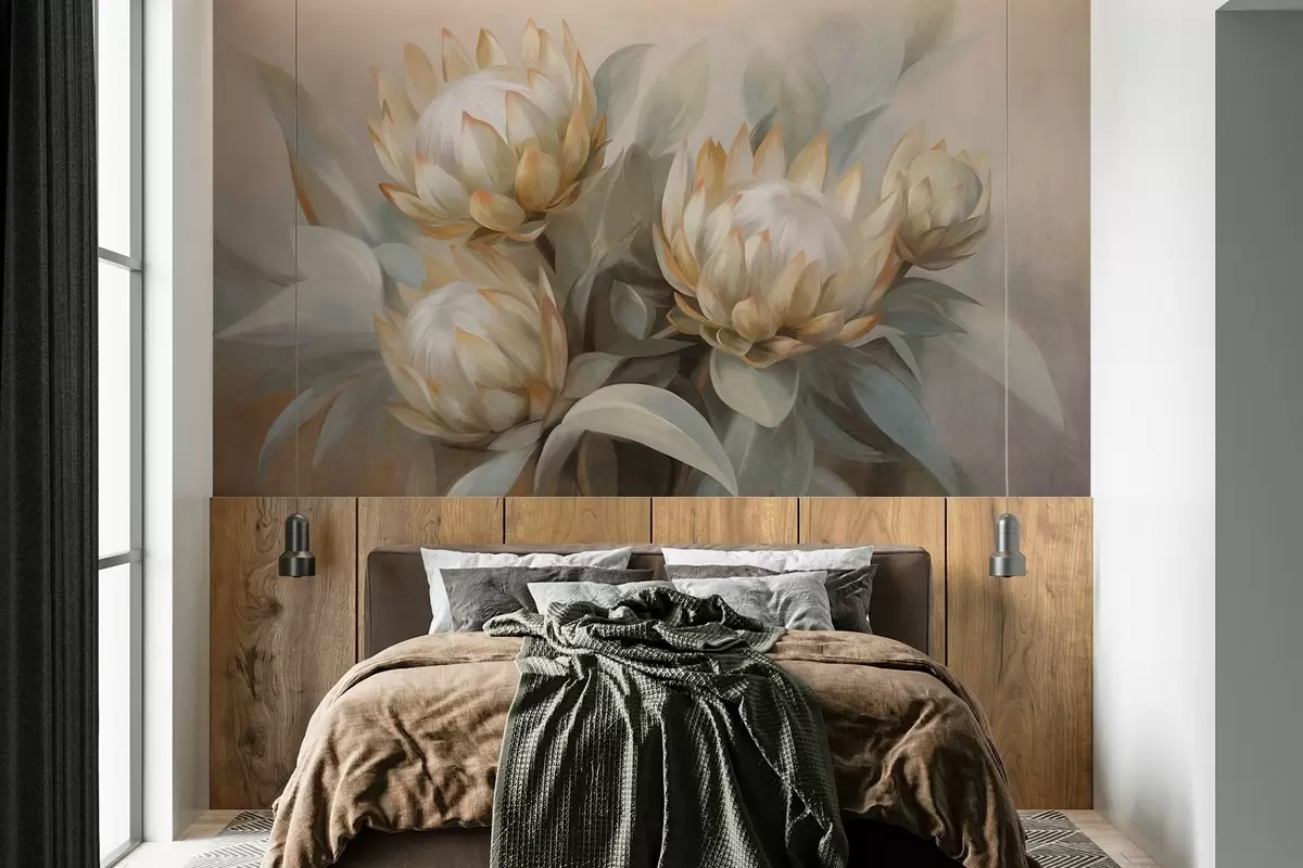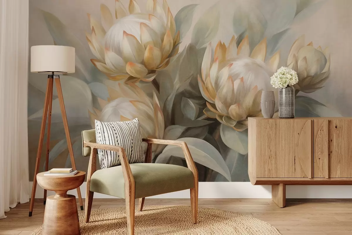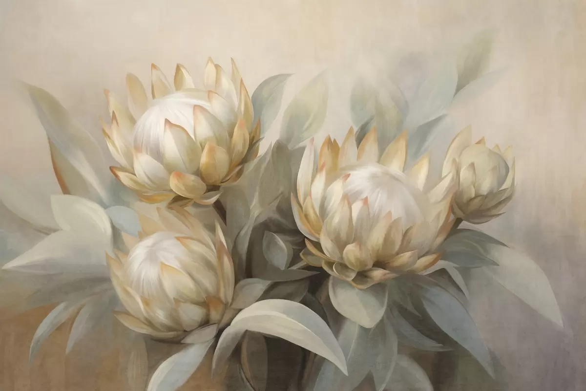 Fototapet Flori protea texturate cu frunze verzi și un fundal moale, estompat Nr. w09738