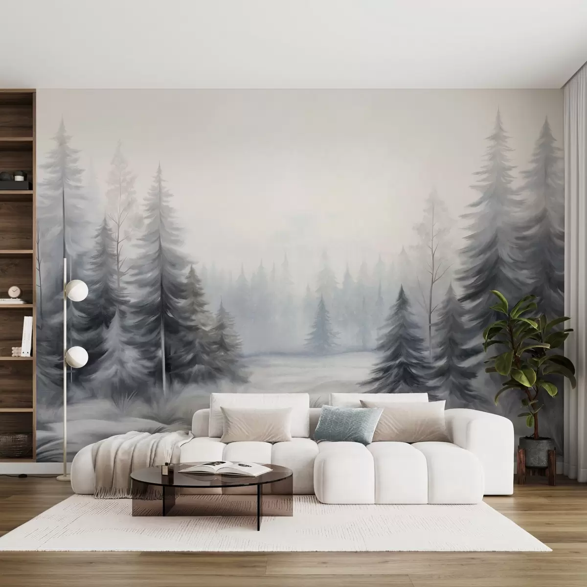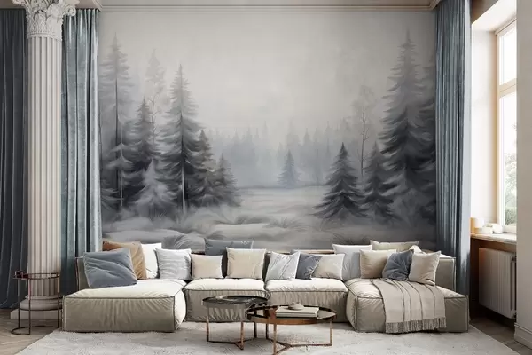 Fototapet Copaci texturați din pădurea de iarnă în ceață, în tonuri discrete de gri și alb Nr. w09745