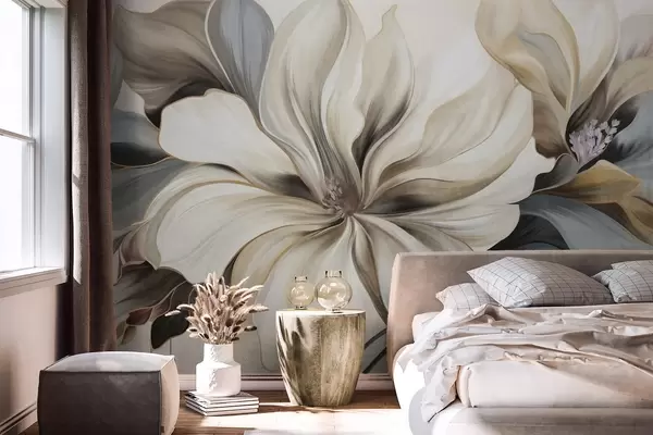 Fototapet Flori mari, cremoase, de magnolie, cu frunze maro și gri, lumină difuză, fundal abstract Nr. w09749