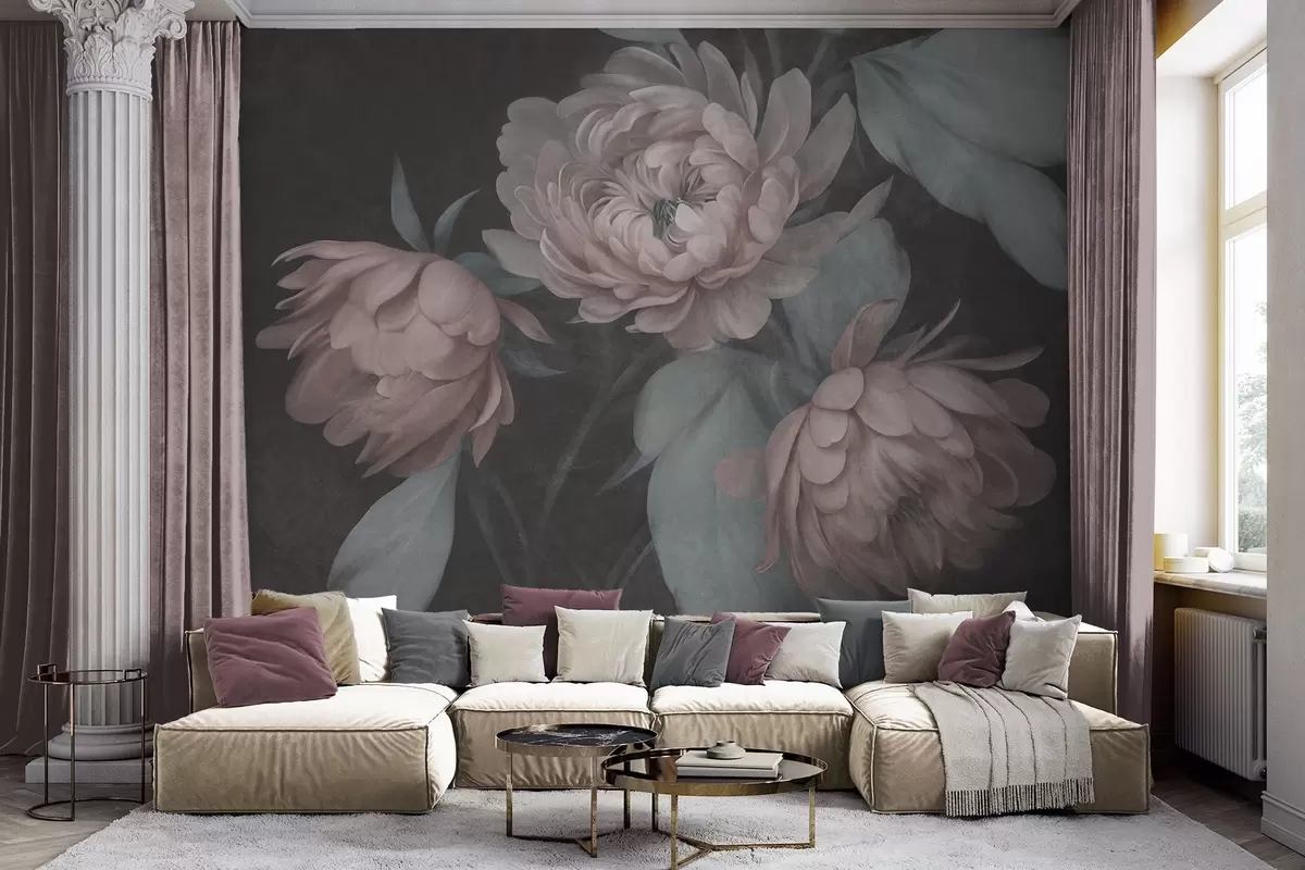 Fototapet Buchete de bujori roz deschis, cu textură, și frunze de un verde discret, pe un fundal întunecat Nr. w09751v1